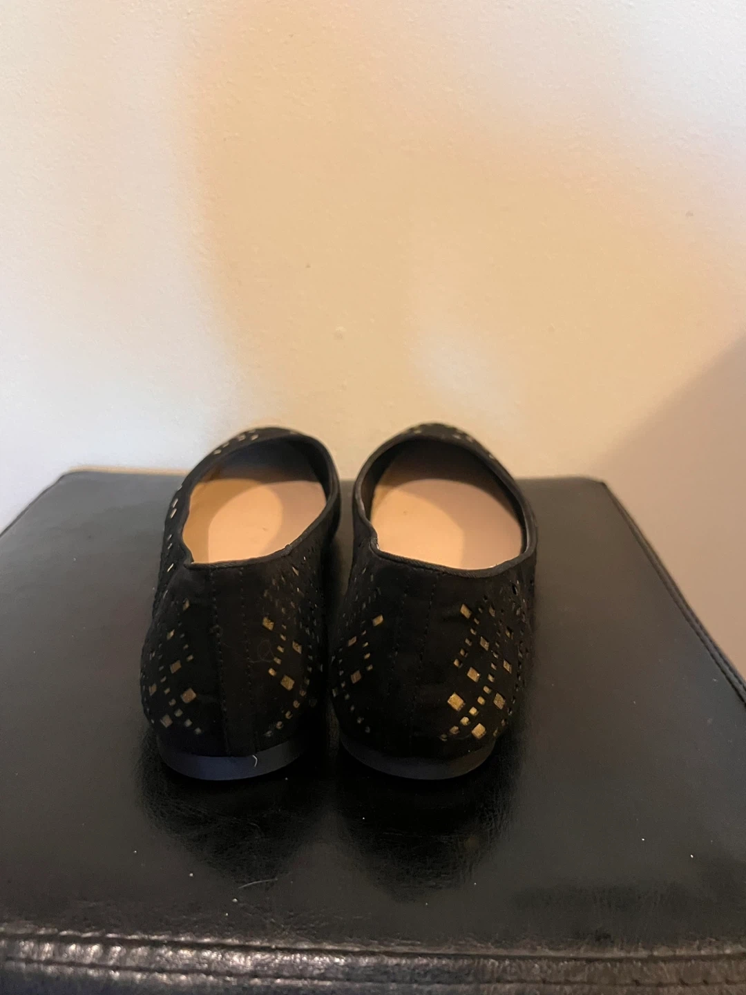 Cute pair of black flats with a gold embellishments in geometric design! They're a size 11 and in brand new great condition. Perfect for adding a touch of sparkle to your outfit.