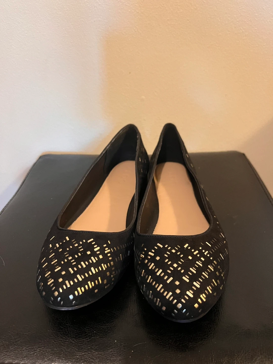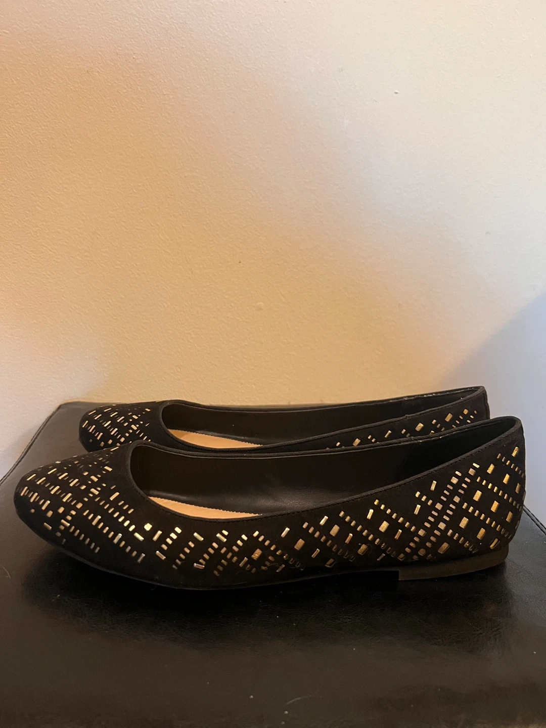 Cute pair of black flats with a gold embellishments in geometric design! They're a size 11 and in brand new great condition. Perfect for adding a touch of sparkle to your outfit.