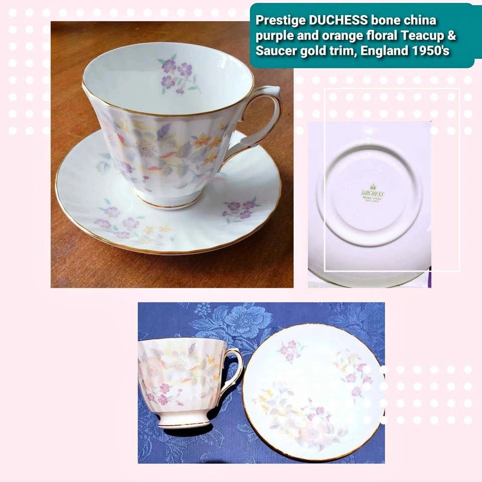 Elegant Duchess fine bone china teacup and saucer set. Features a lovely purple and orange floral design with classic gold gilded trim. Made in England, 1950s. Excellent vintage condition. No chips, cracks, or crazing. Gold trim is well-preserved. Please check my other postings; a bundle deal will get you a discount. Pickup: Toronto.