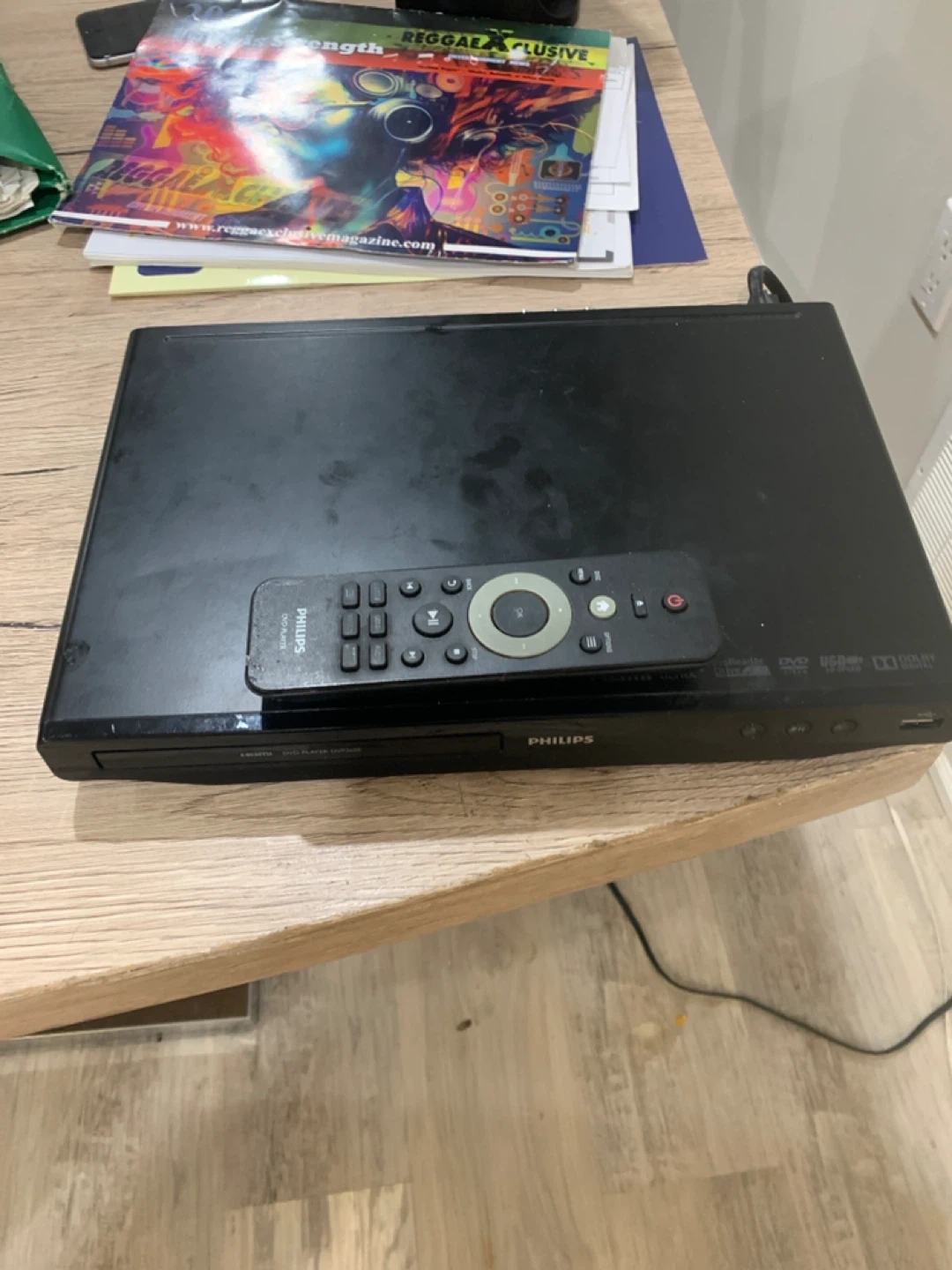 This is a Philips DVD player, comes with its original remote control. It's black and has HDMI output. Loads discs quickly and plays DVDs smoothly.