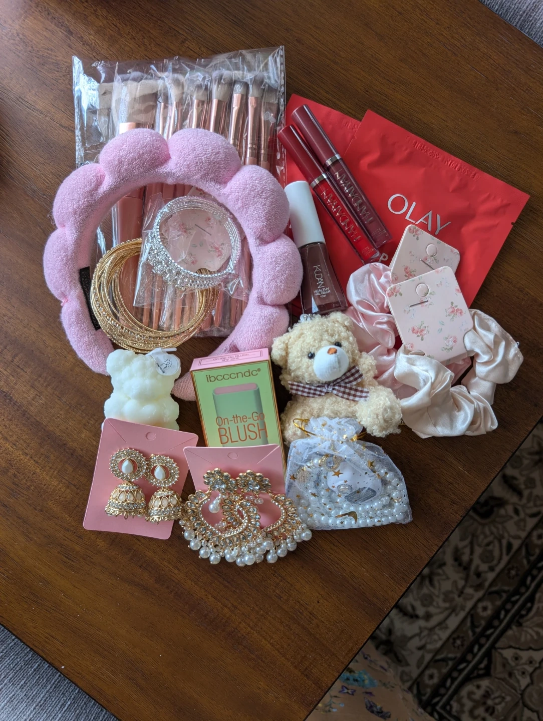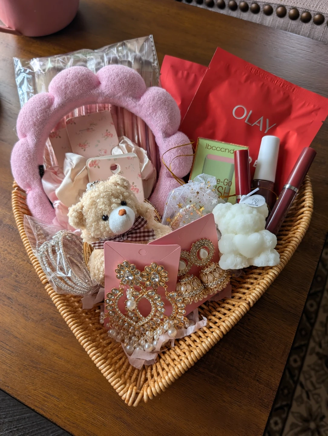 This gift basket is packed with lovely items. It includes a pink plush headband, makeup brushes set, gold bangles, bracelet, 2 decorative earrings, teddy bear candle, and a small teddy bear. You'll also find makeup like blush and 2 lip gloss, face mask, nail polish, tasbih set, plus silky scrunchies.