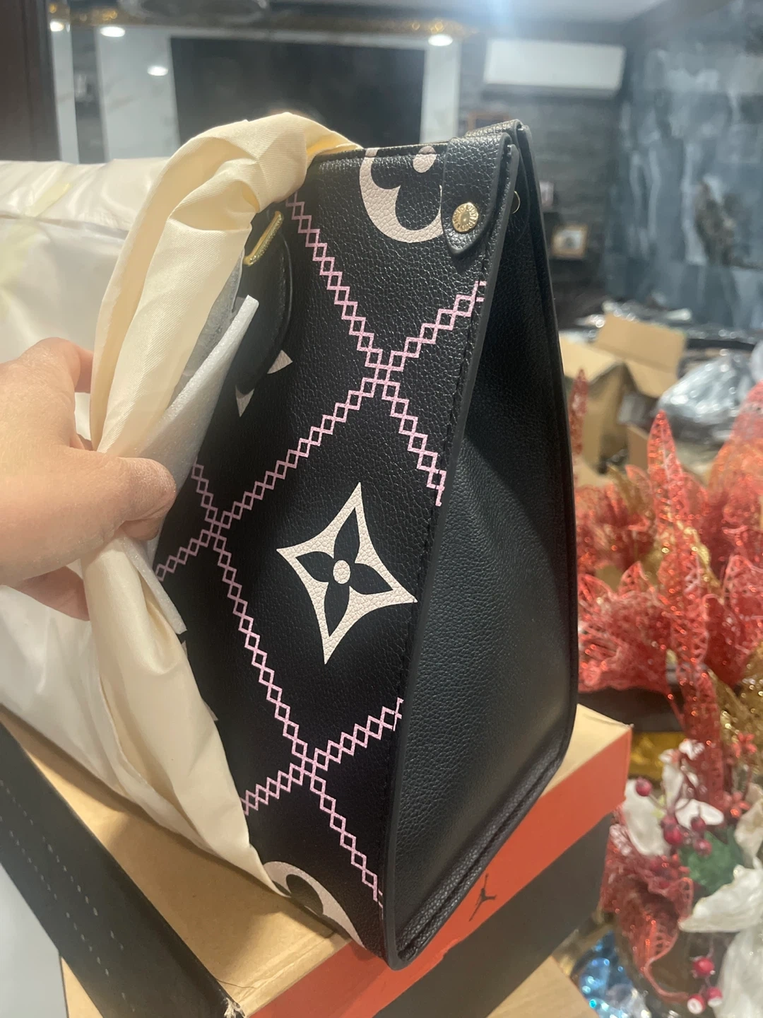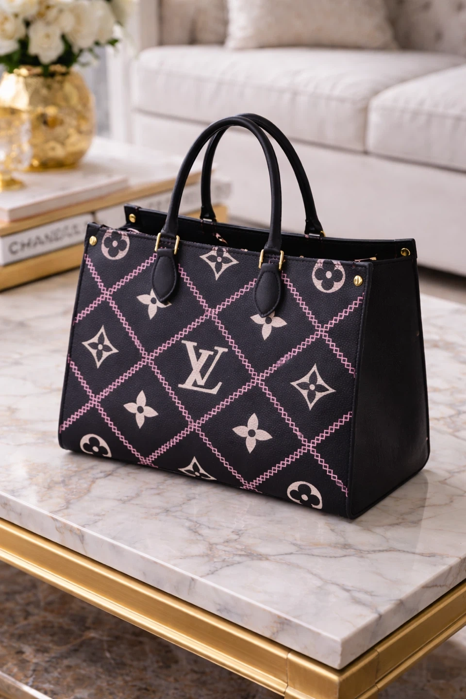 Louis Vuitton tote bag in black with a pink and white monogram pattern. It features a spacious interior with zippered pockets. Made from durable leather. In liquidations