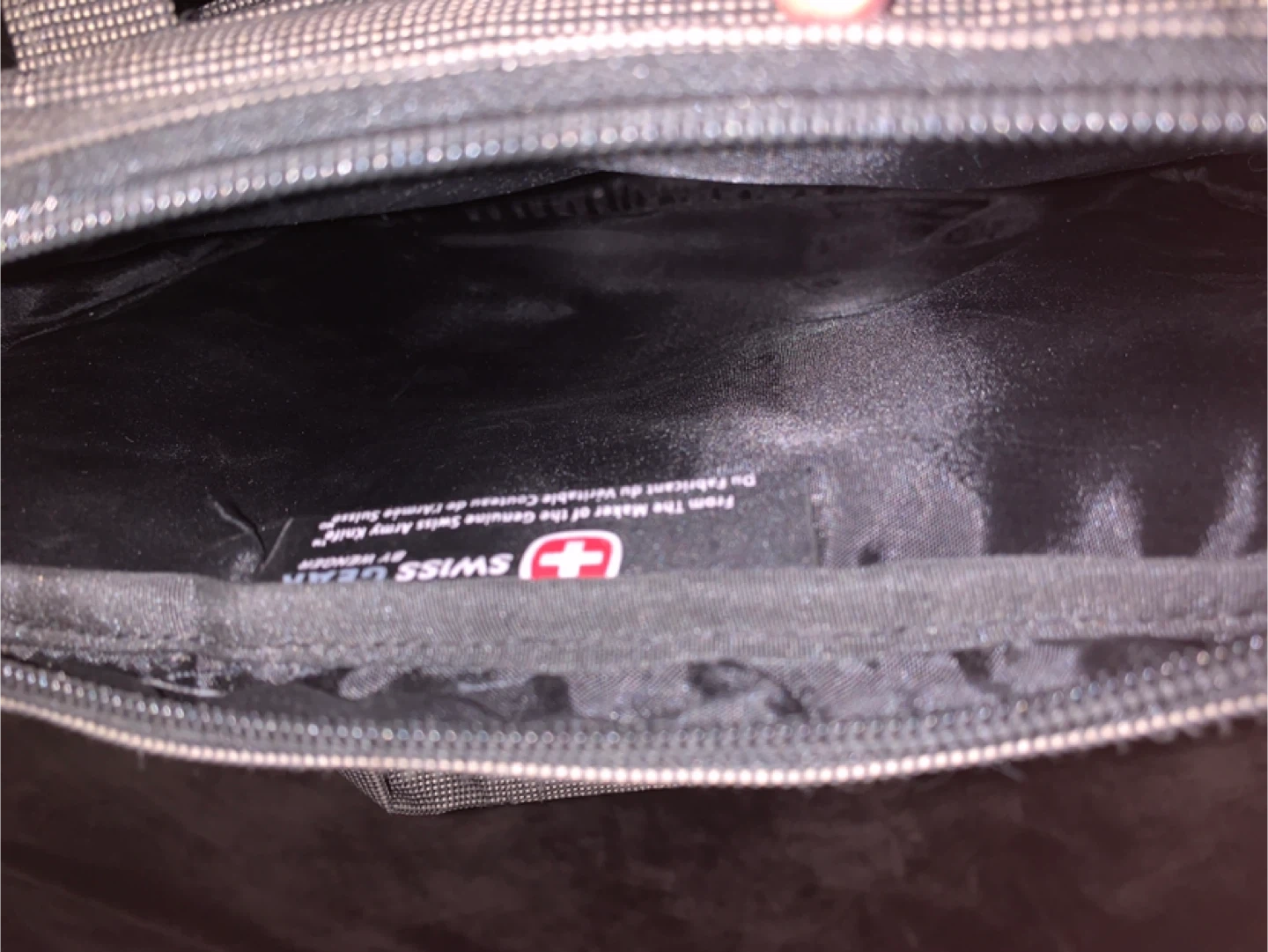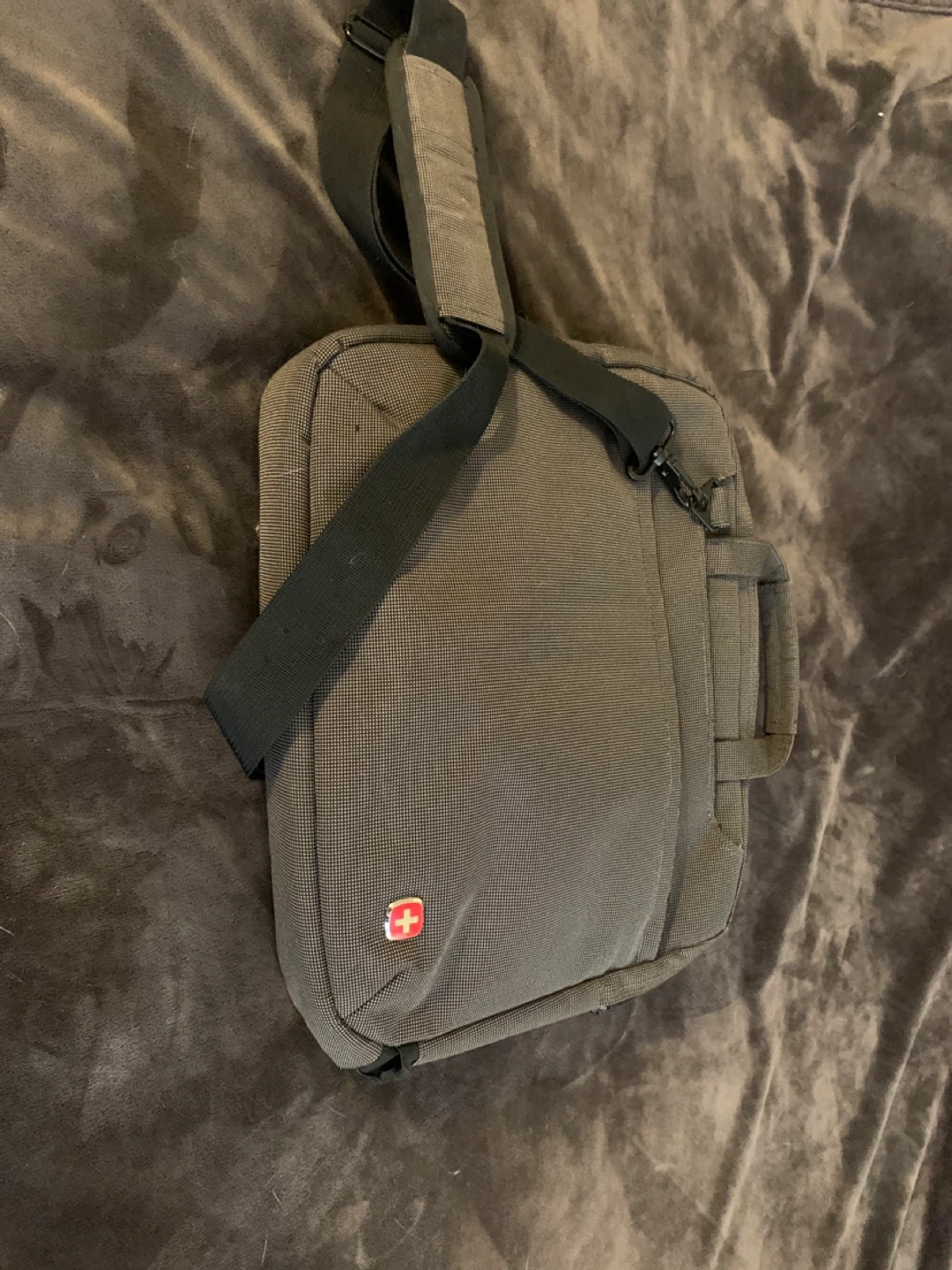 This is a Swiss Gear messenger bag. It's a grey bag with multiple zippered compartments. The interior lining is black.