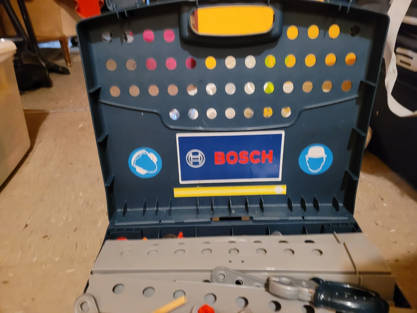 This is a Bosch toy workbench with a variety of tools and accessories. It's great for little builders and aspiring carpenters. Includes a toy drill, hammer, pliers, and more!