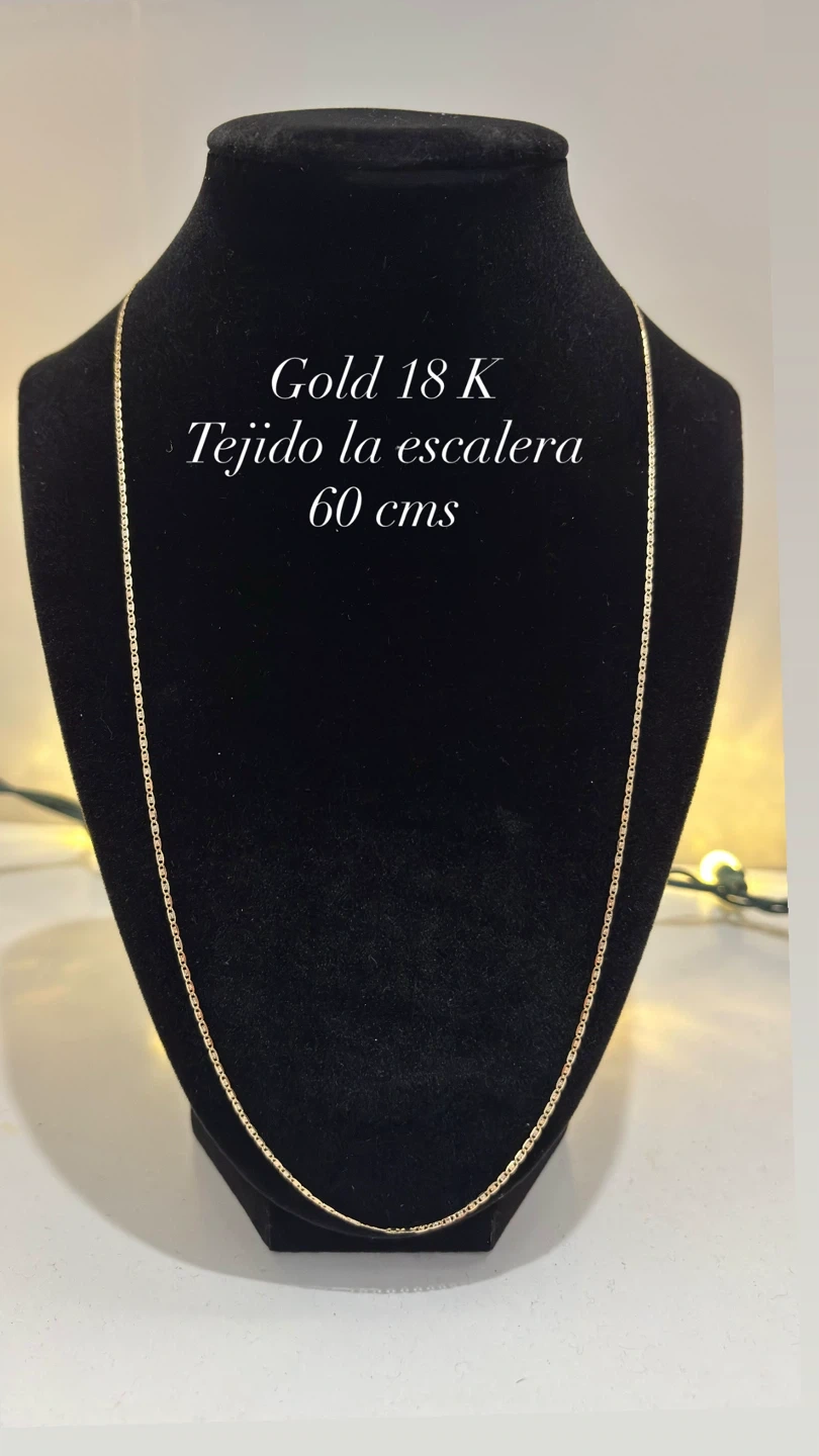 Selling a beautiful 18K gold chain. It features a 'tejido la escalera' (ladder weave) design and measures 60 cm in length. Perfect for adding a touch of elegance to any outfit!