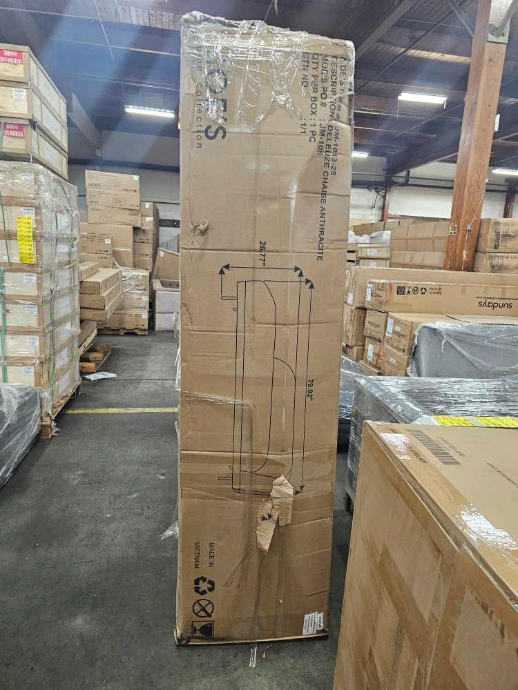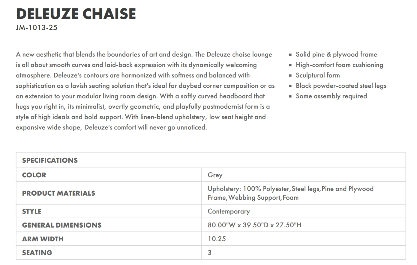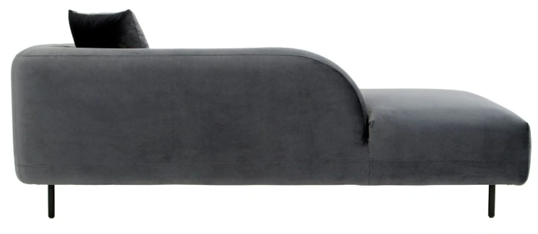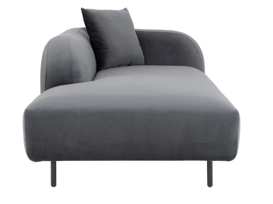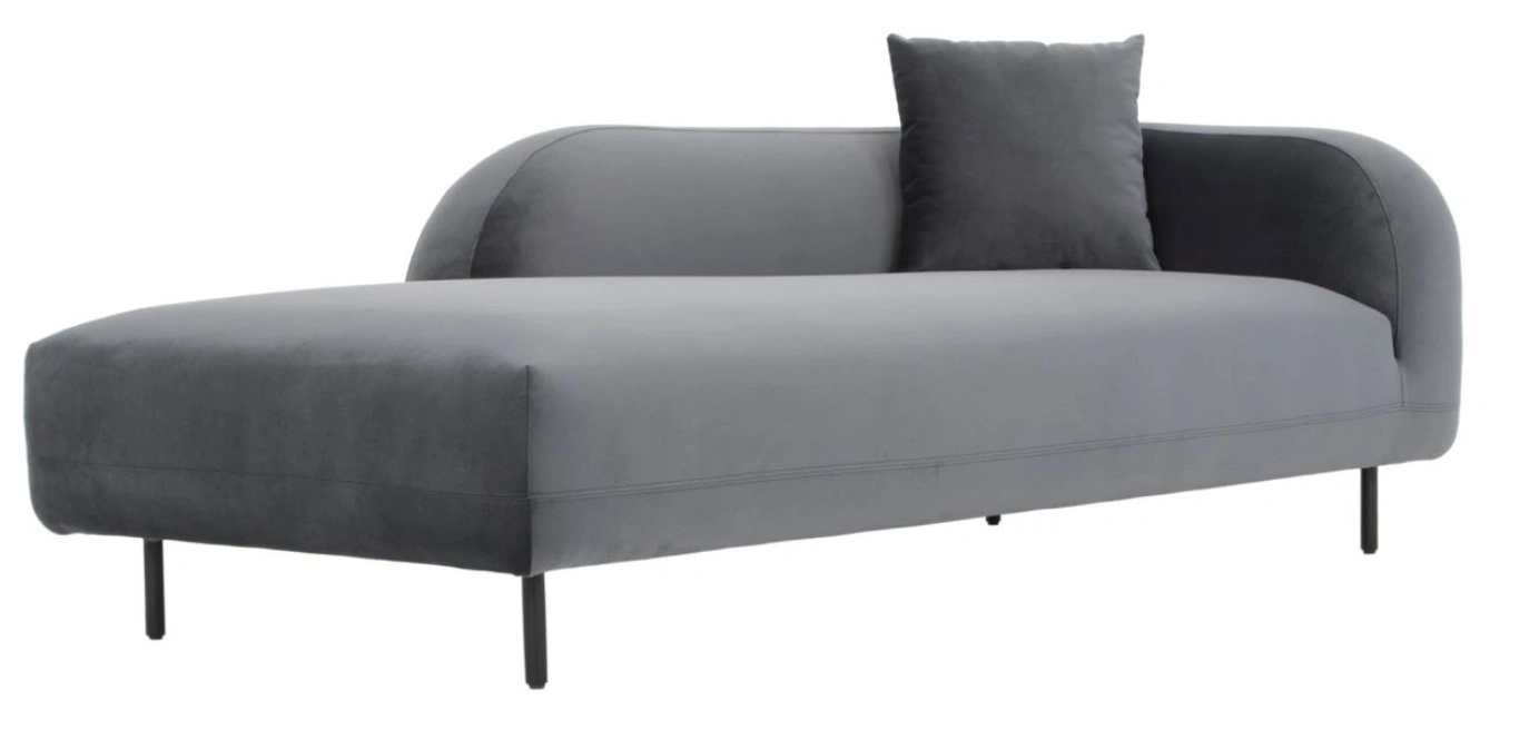Modern chaise lounge. Grey velvet upholstery. Solid pine & plywood frame. Black powder-coated steel legs. Some assembly required. Contemporary style. Minimalist design. Comfortable and stylish. Moes Home Collection. New in box.