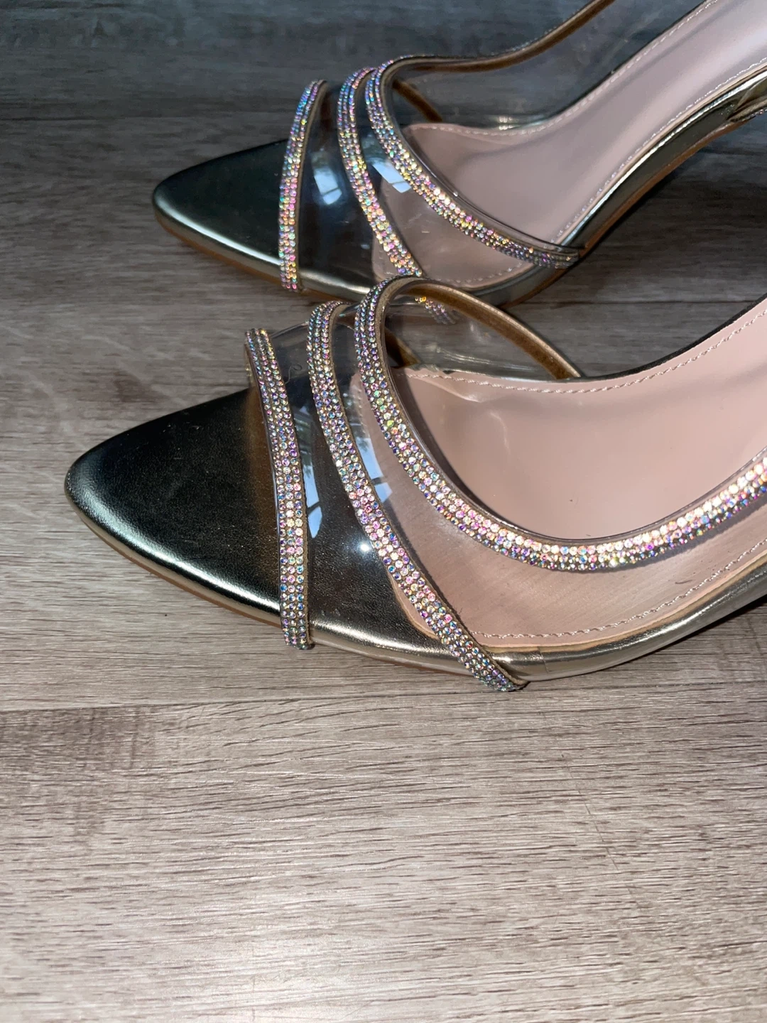 65Selling a pair of Delicacy gold heels in size 9. They feature a clear strap design with rhinestone detailing. Comes with the original box.