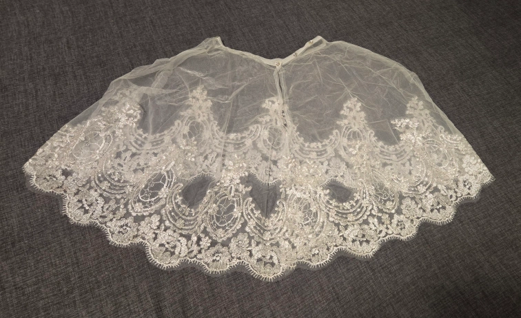 Beautiful off-white bridal bolero. Features delicate lace detailing and sheer tulle. Perfect for adding a touch of elegance to your wedding day attire 19 inch long. One size fits most. only pick up
