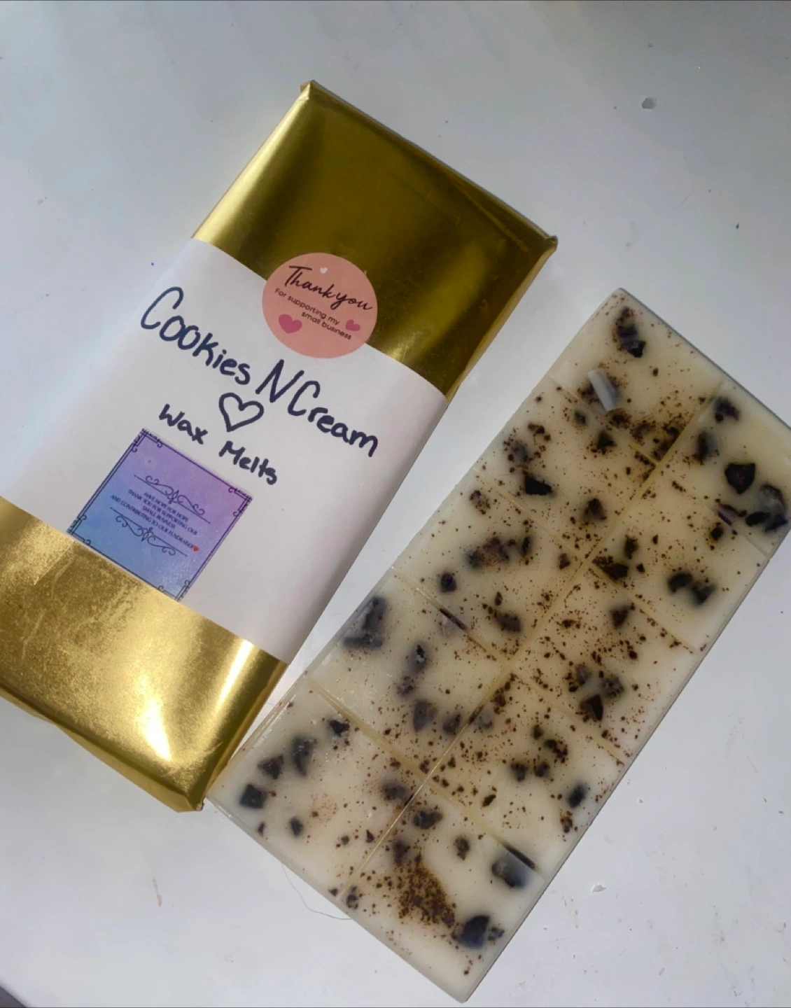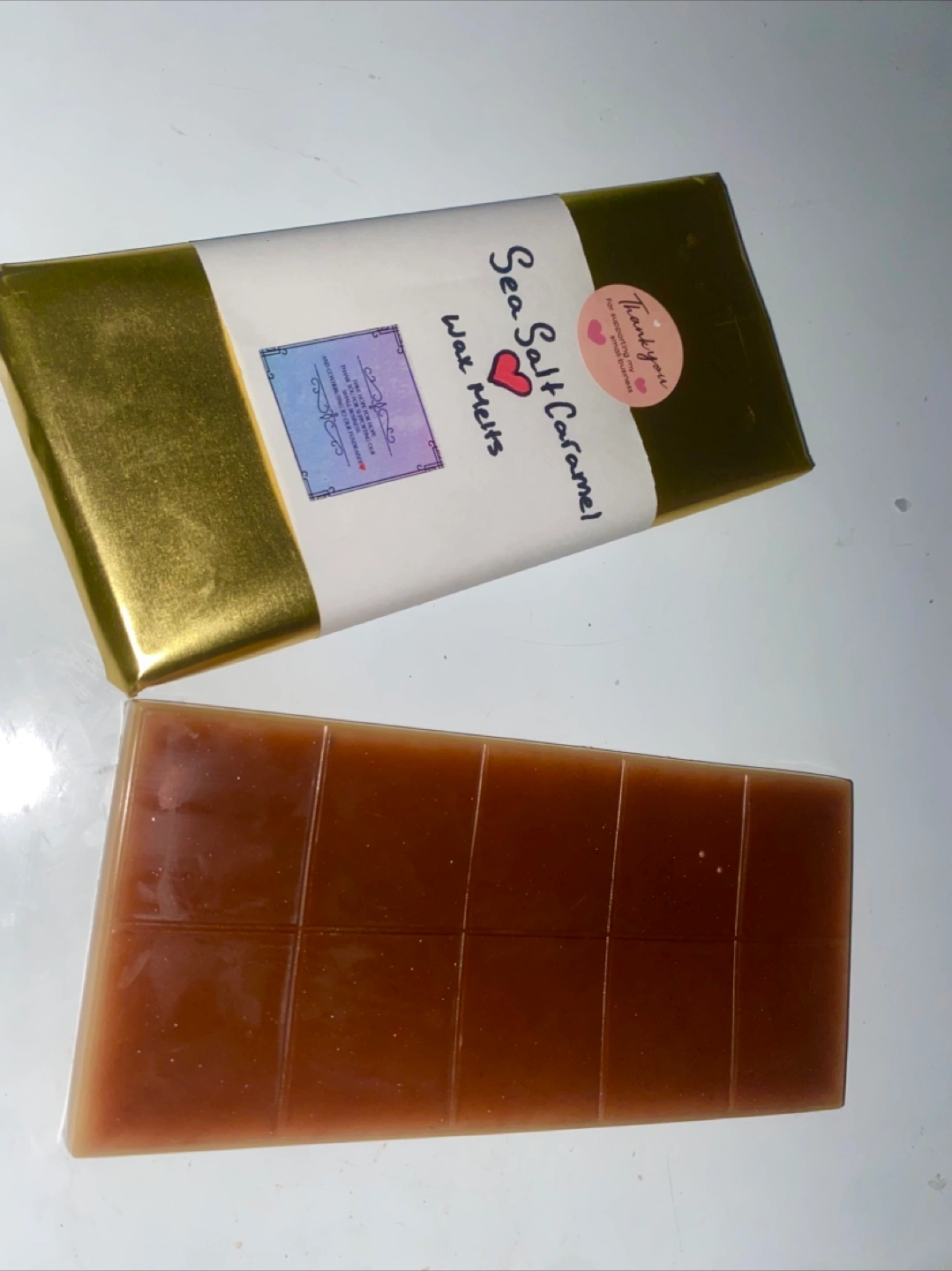 20Hi there we have nice beautiful candles and wax melt bar. Has a gold wrapping. Would be perfect to use for a calming scent experience. The chocolate bar wax melts are $20 each With different kinds of sense and designs And the candles are from $10 to $35 with different sense and designs We also do custom detail and sense candles aswell