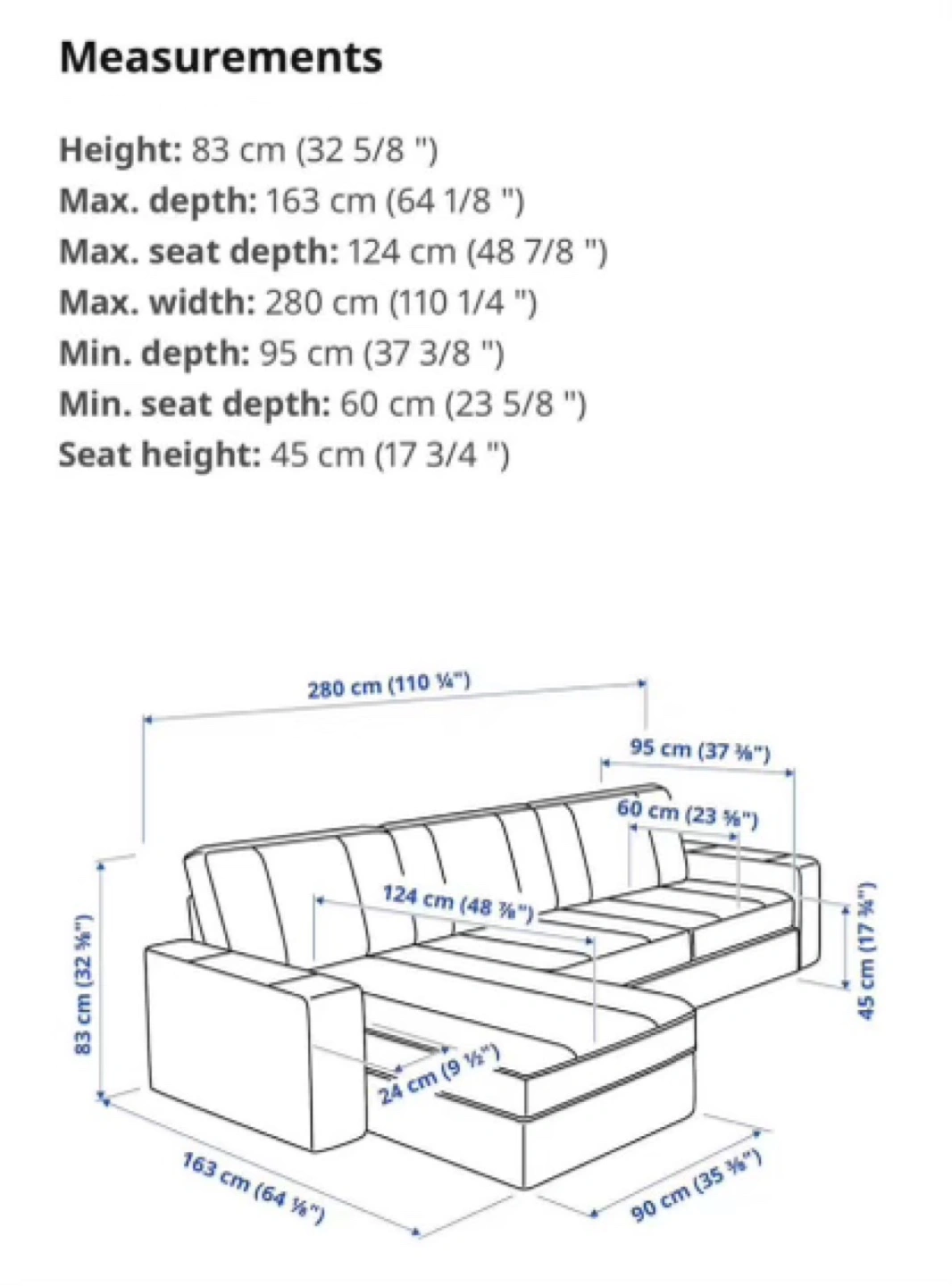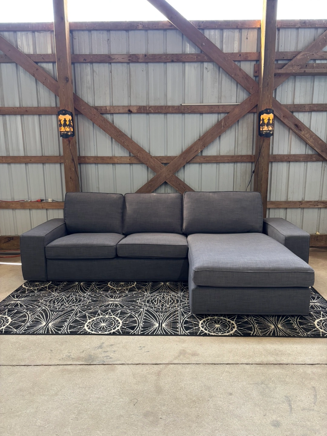 67**$400** IKEA Kivik Sectional in Grey ๐๏ธ Has been professionally steam cleaned and wiped down. Info - machine washable cushion covers for all cushions. - Bottom of middle cushion has tear through one layer of fabric. Unable to see when put down. - East to connect and disconnect. - Thick filled cushions with no deformations. Dimensions available in photos Delivery available, send location for quote ๐ Couch disposal available too.