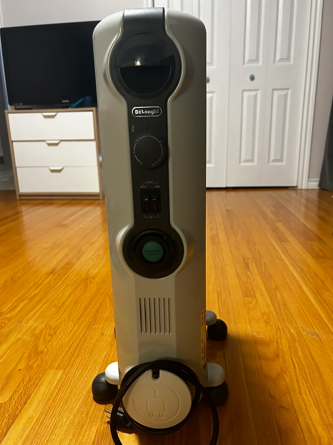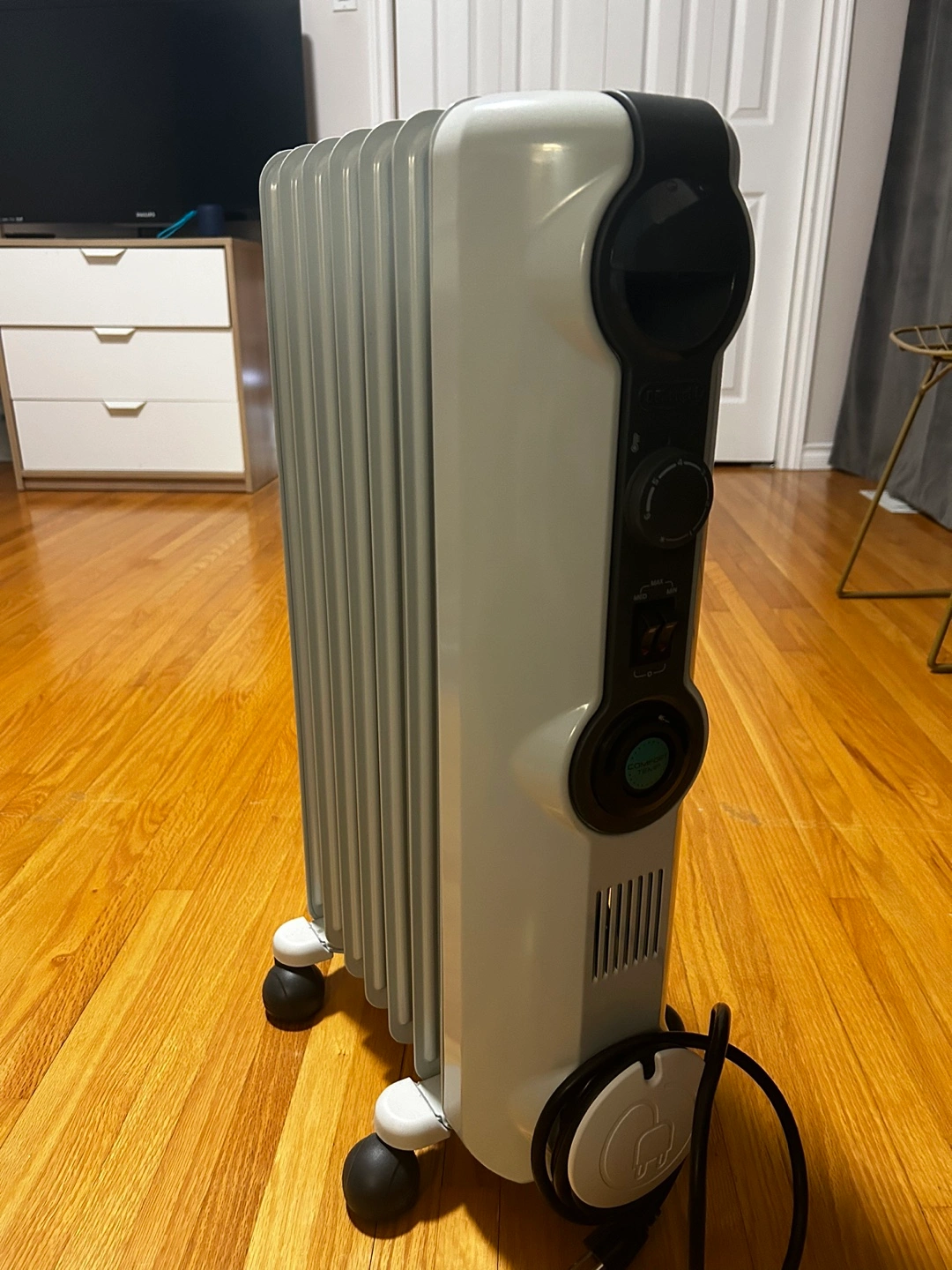 Oil-filled radiator heater with wheels. Includes a timer, thermostat, and three heat settings.