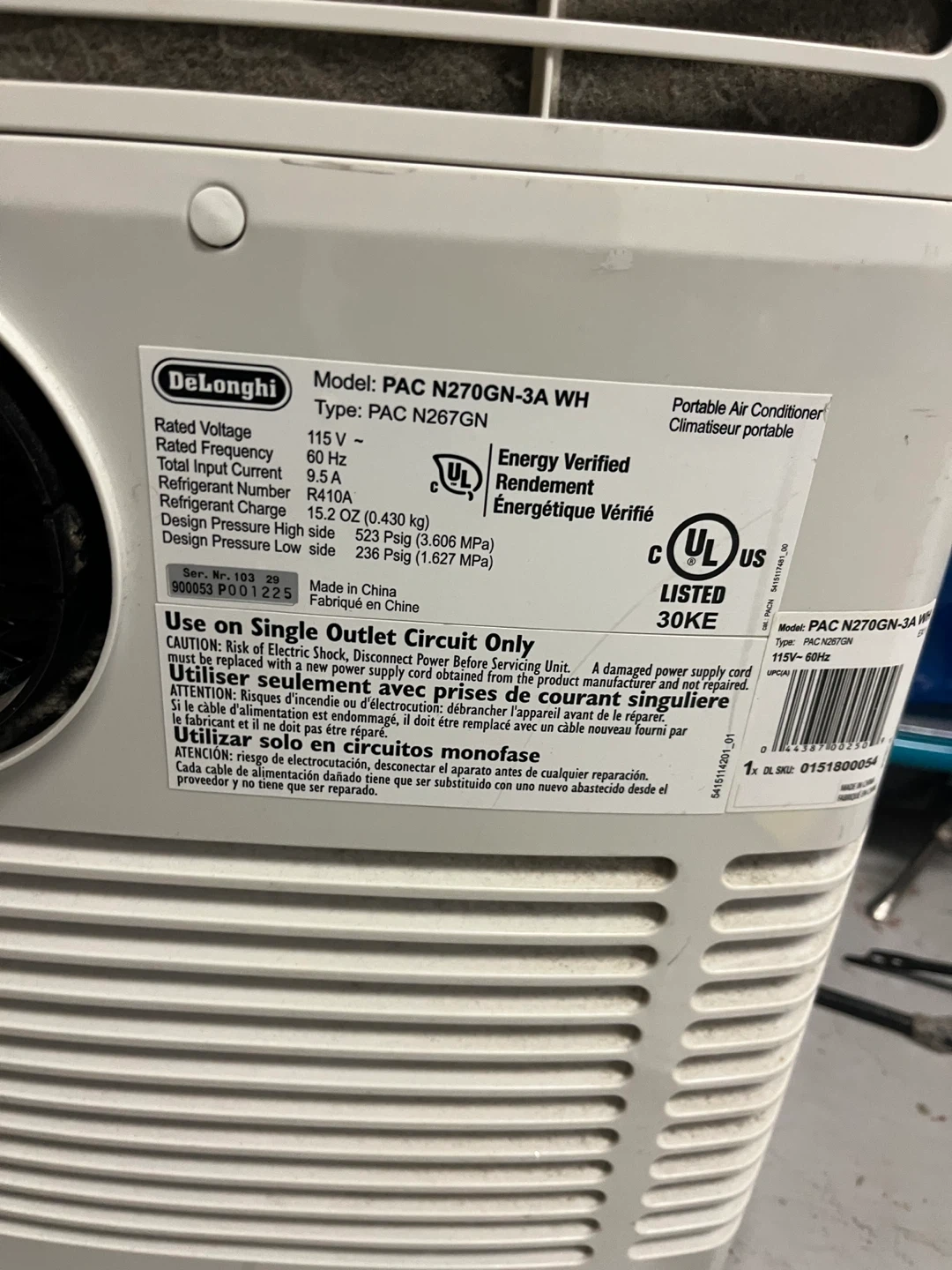 10Selling a DeLonghi portable air conditioner, model PAC N270GN-3A WH. It's a great way to keep cool during the summer months. It has some cosmetic wear and tear, but is fully functional.