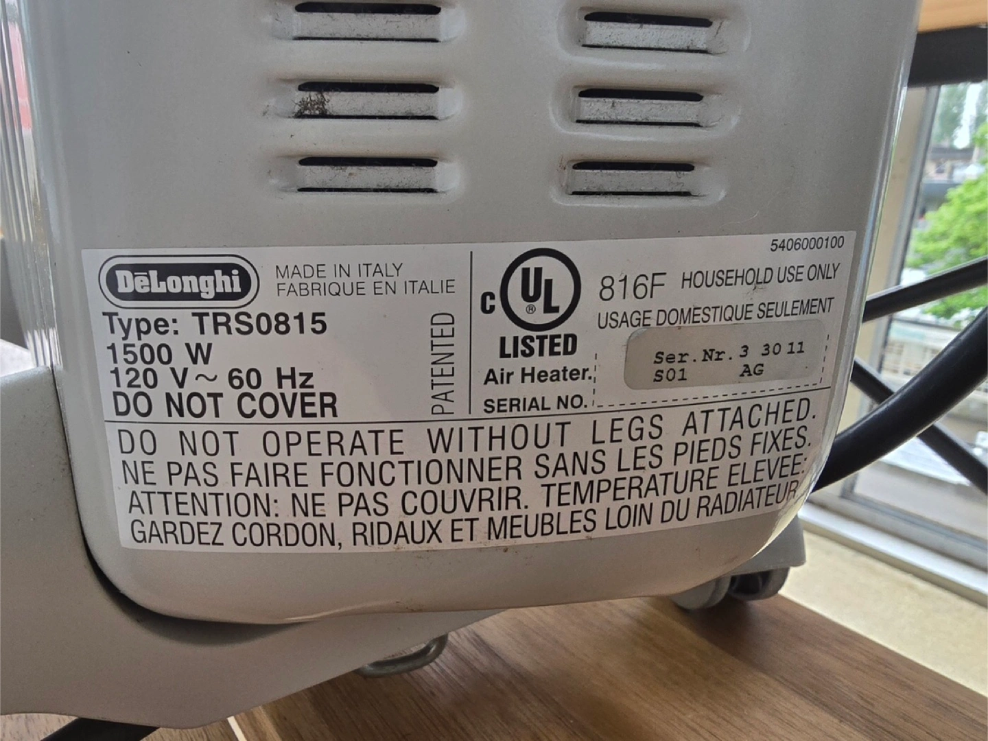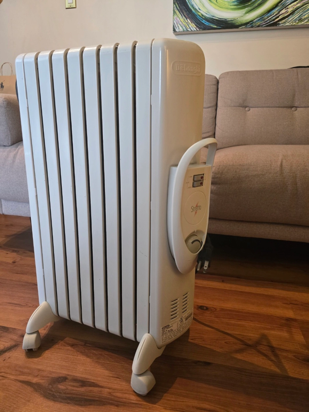 Electric radiator heater. Features adjustable thermostat. Includes carrying handle and wheels for easy mobility. Good for supplemental home heating.