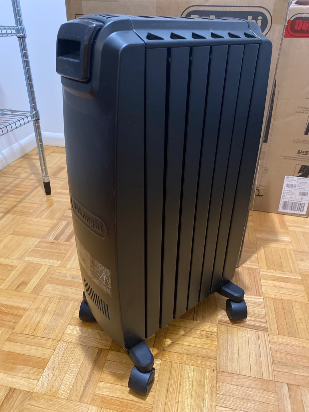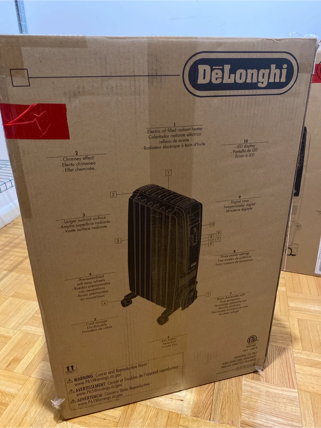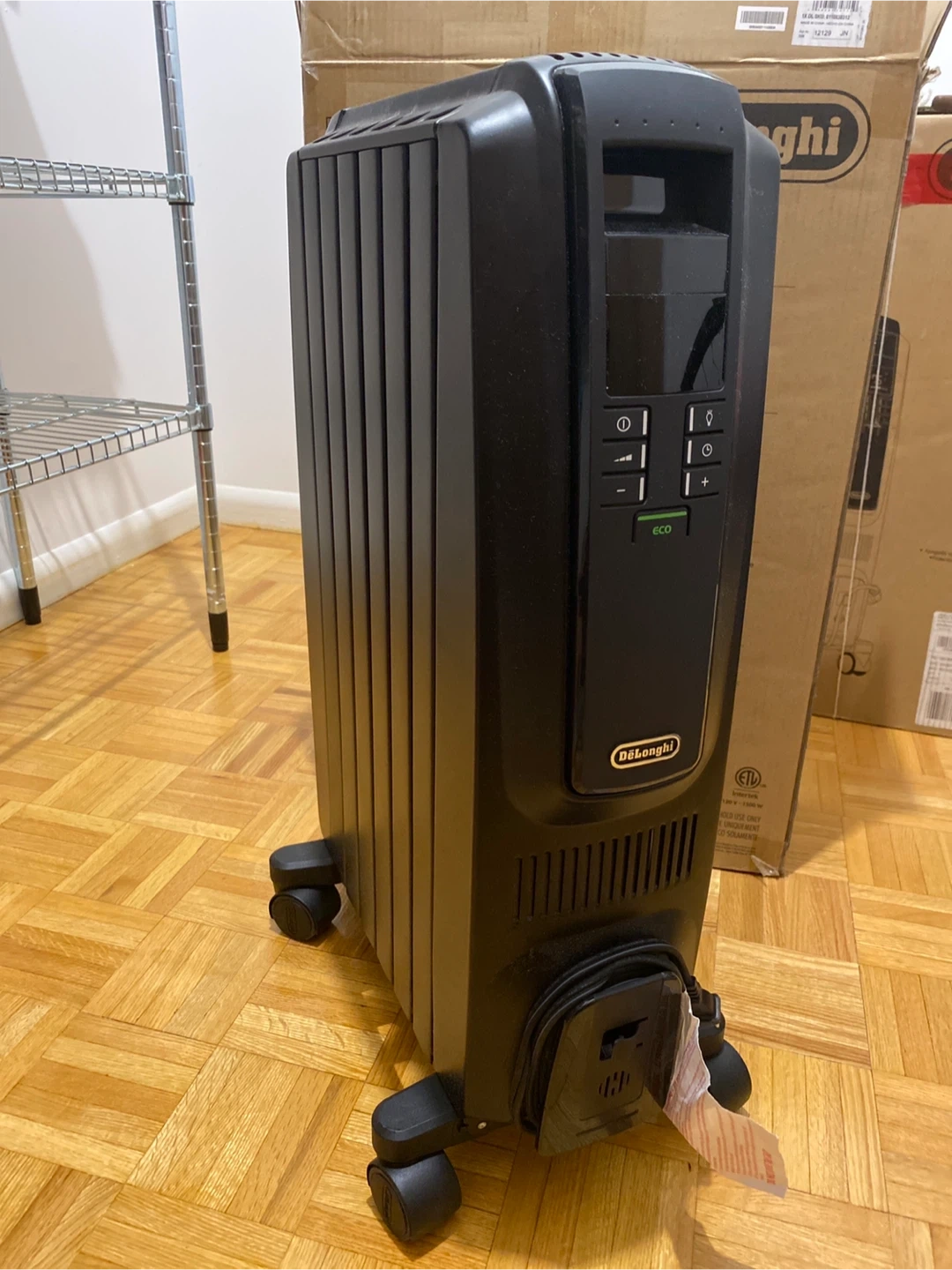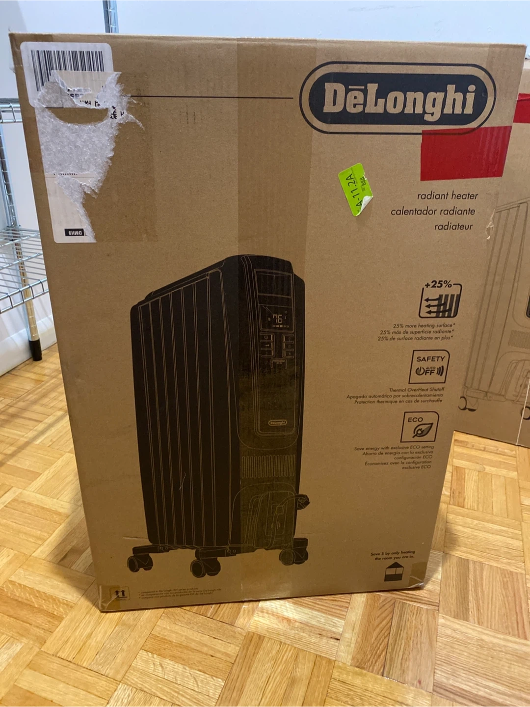 Selling a DeLonghi oil-filled radiant heater. It features an LED display, digital timer, and three power settings. Save energy with exclusive ECO setting. Model number is TRD40615EBK-6A