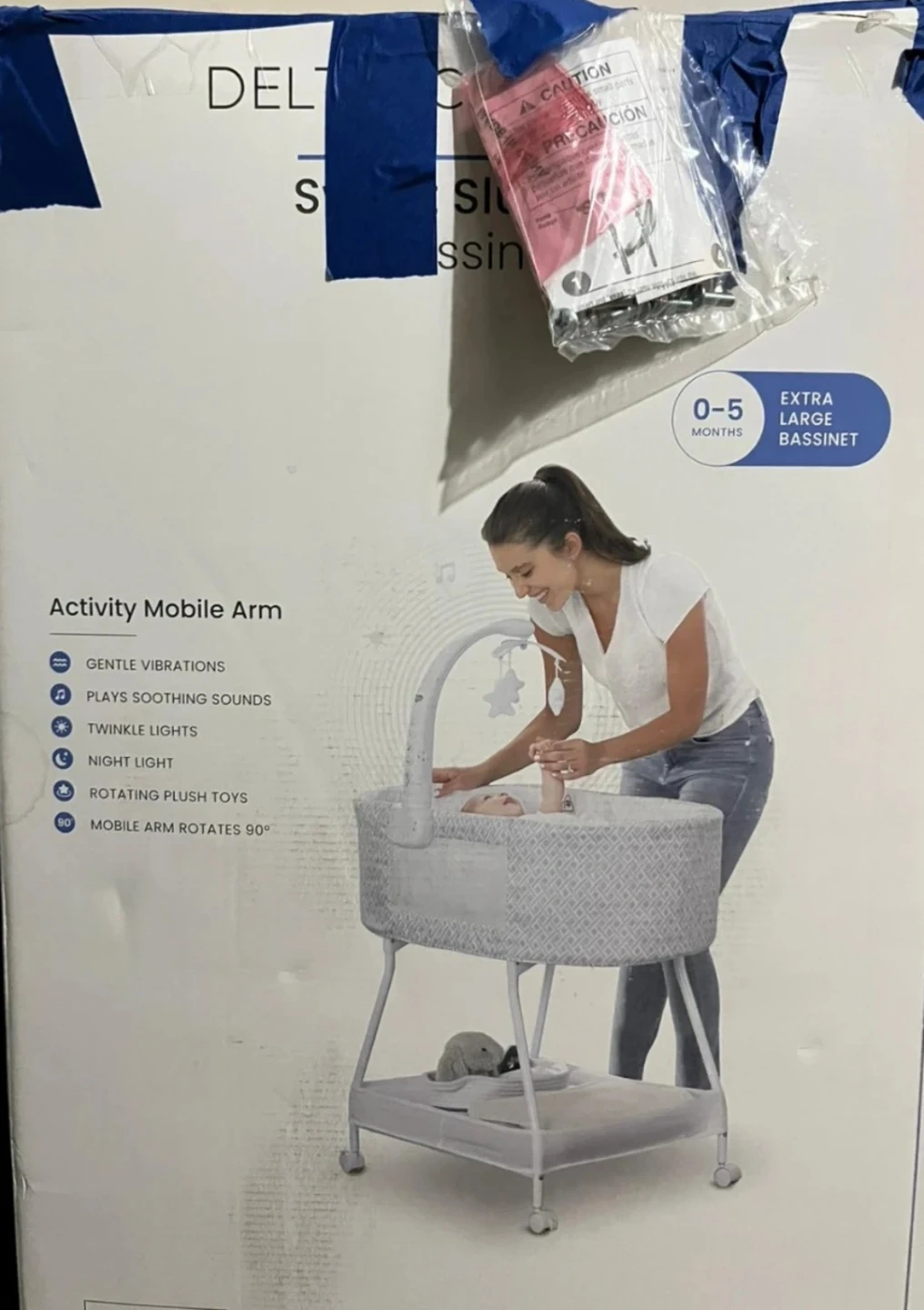 60Selling a Delta Children extra large bassinet, suitable for babies aged 0-5 months! It has gentle vibrations, soothing sounds, twinkle lights, and a night light. The mobile arm rotates 90 degrees and includes rotating plush toys. Perfect for your little one!