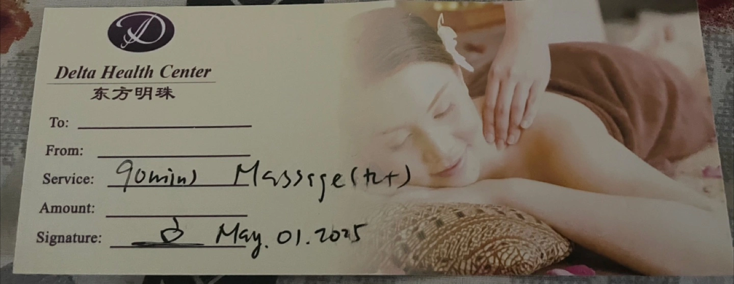 74Unused gift voucher for a 90-minute massage at Delta Health Center. Voucher dated May 1, 2025. Image of massage shown.