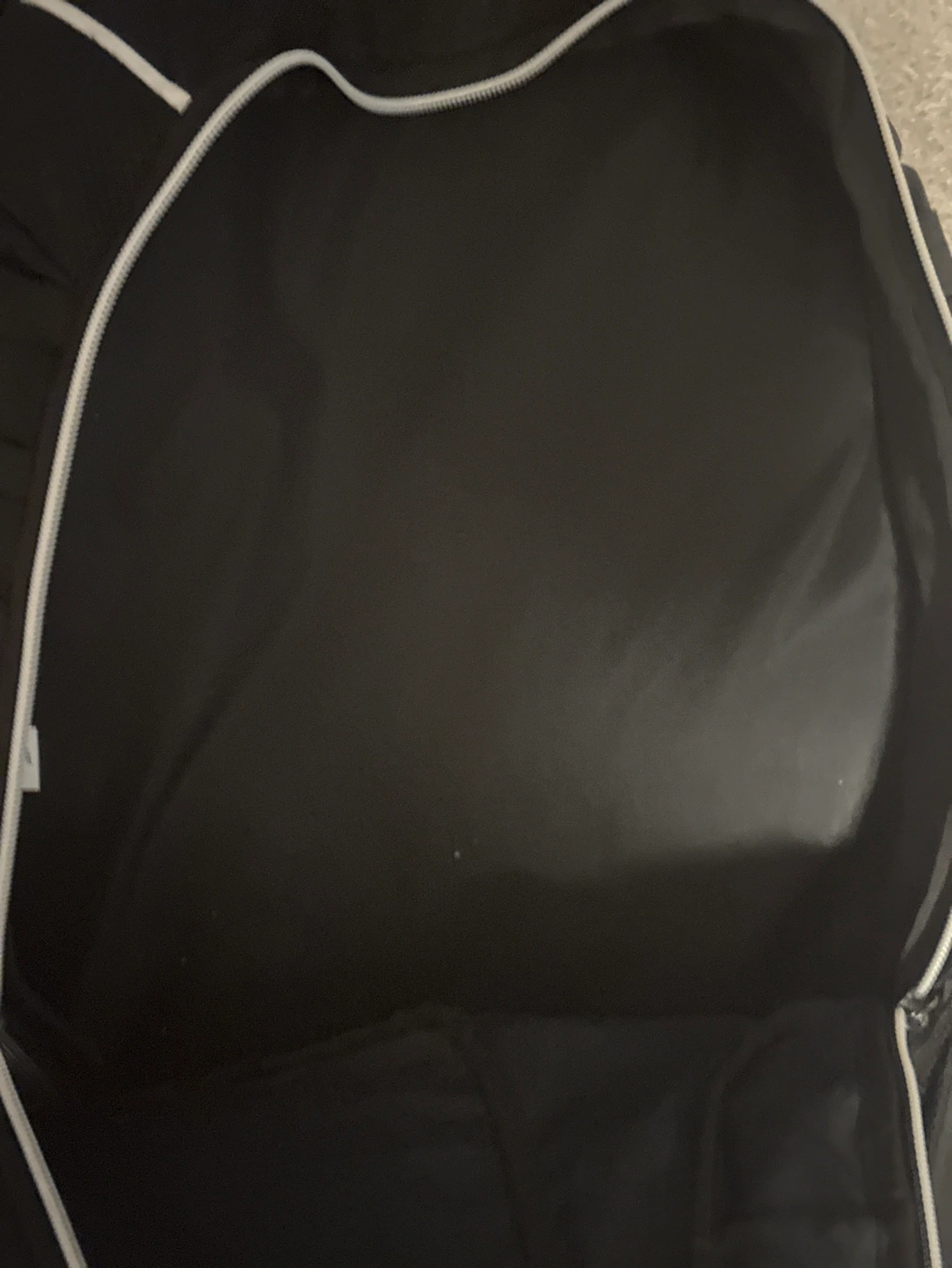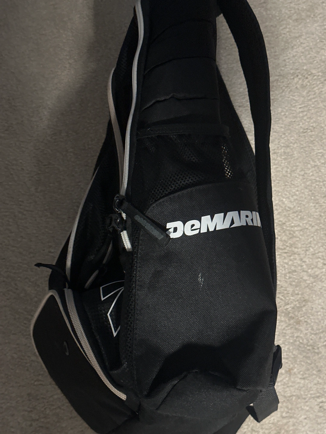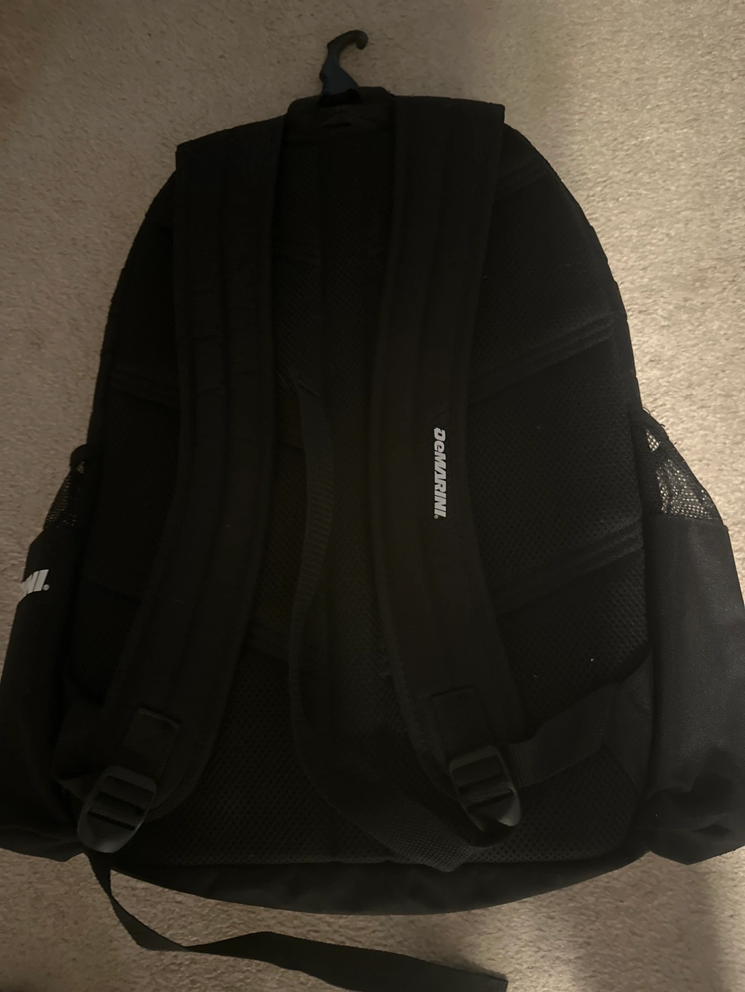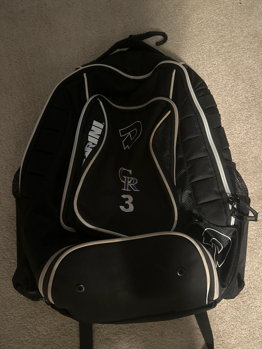 Black baseball backpack with white trim. It has a large main compartment and multiple smaller compartments for organization. There is a mesh pocket on the side of the backpack and a zipper pocket on the front.