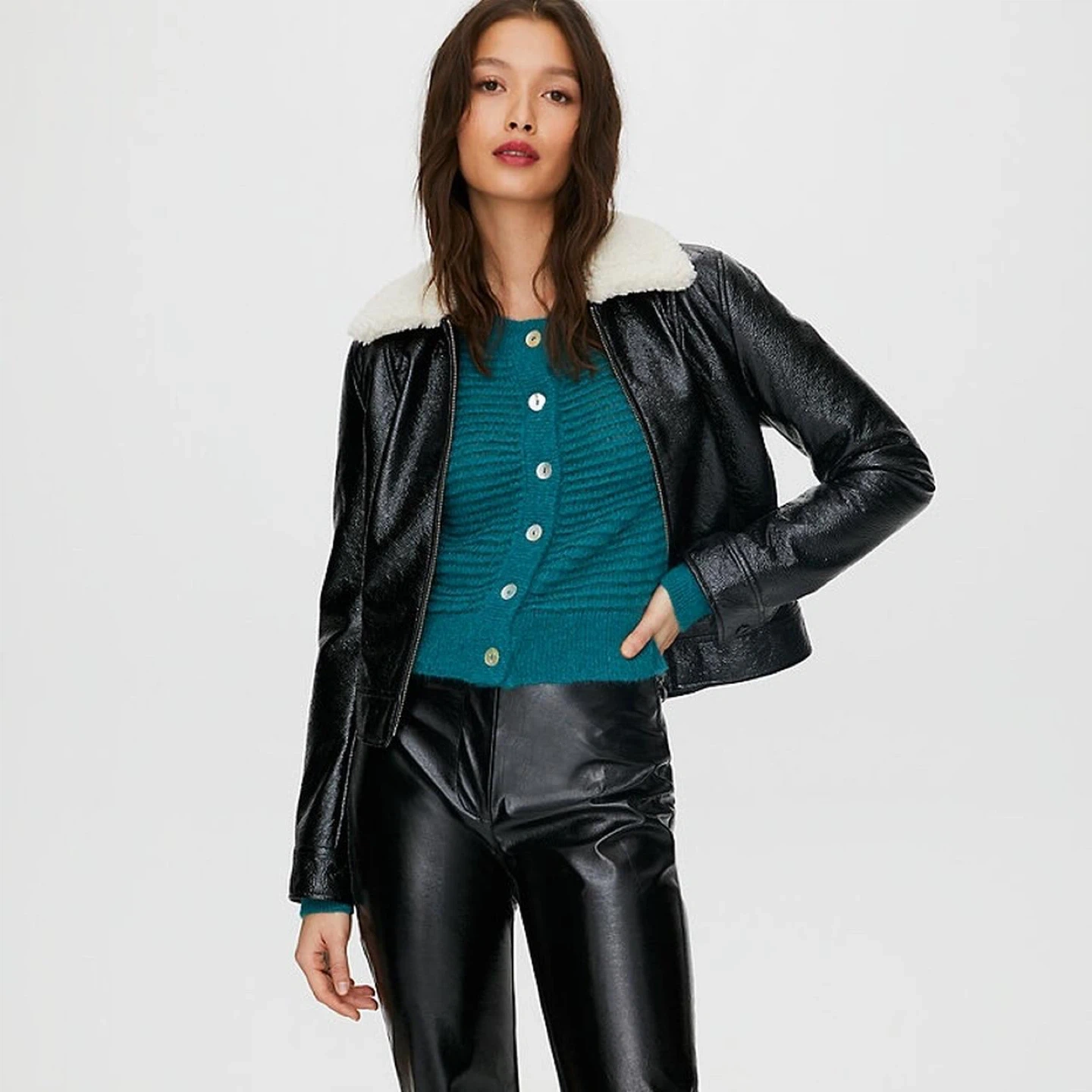 Wilfred Black Patent Leather Sherpa Collar Jacket - Medium