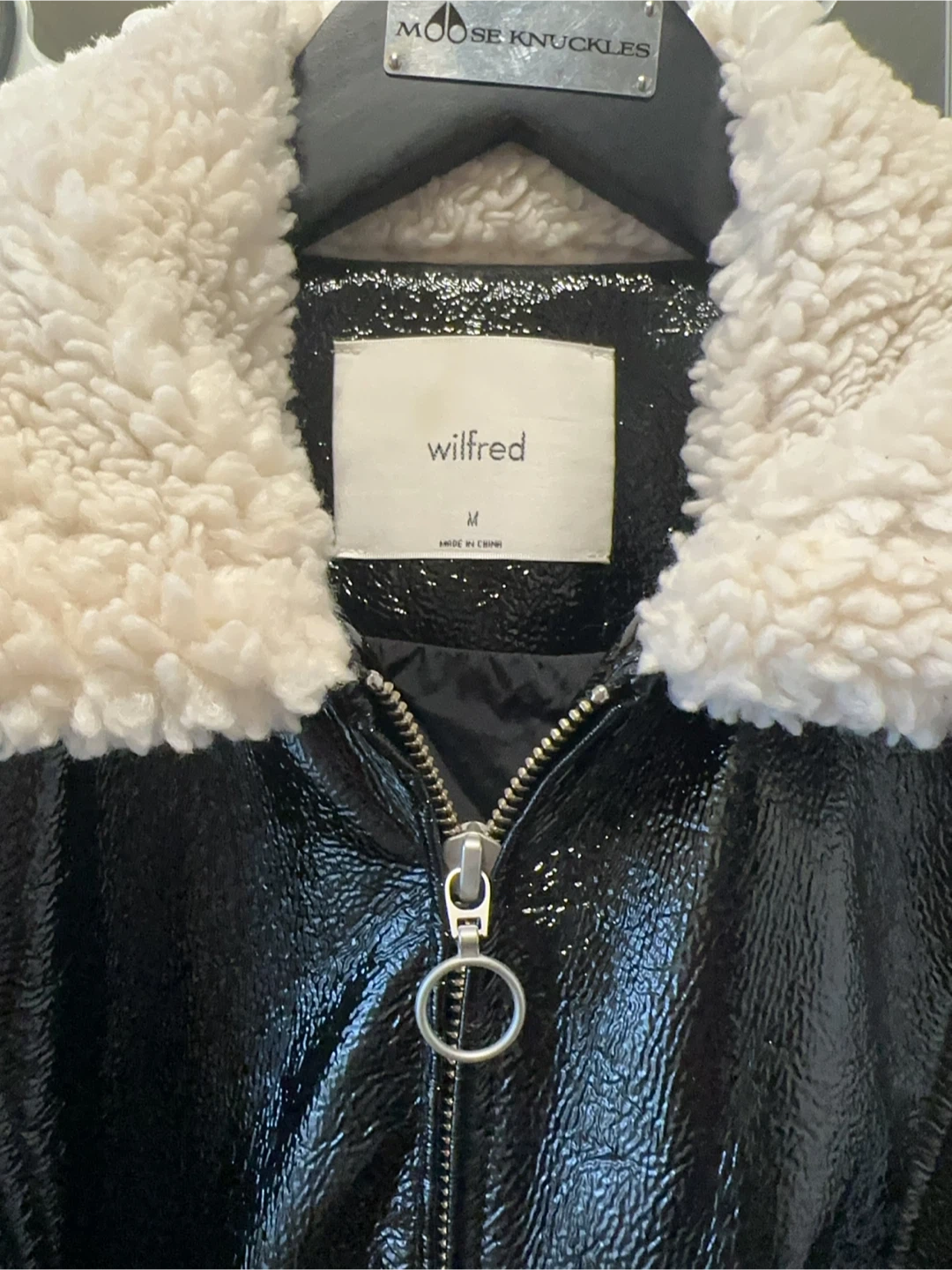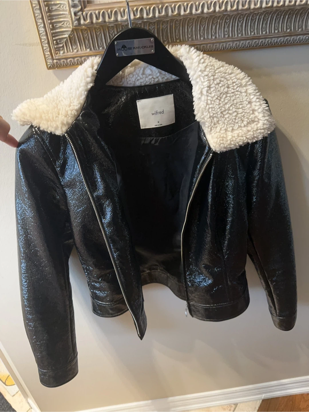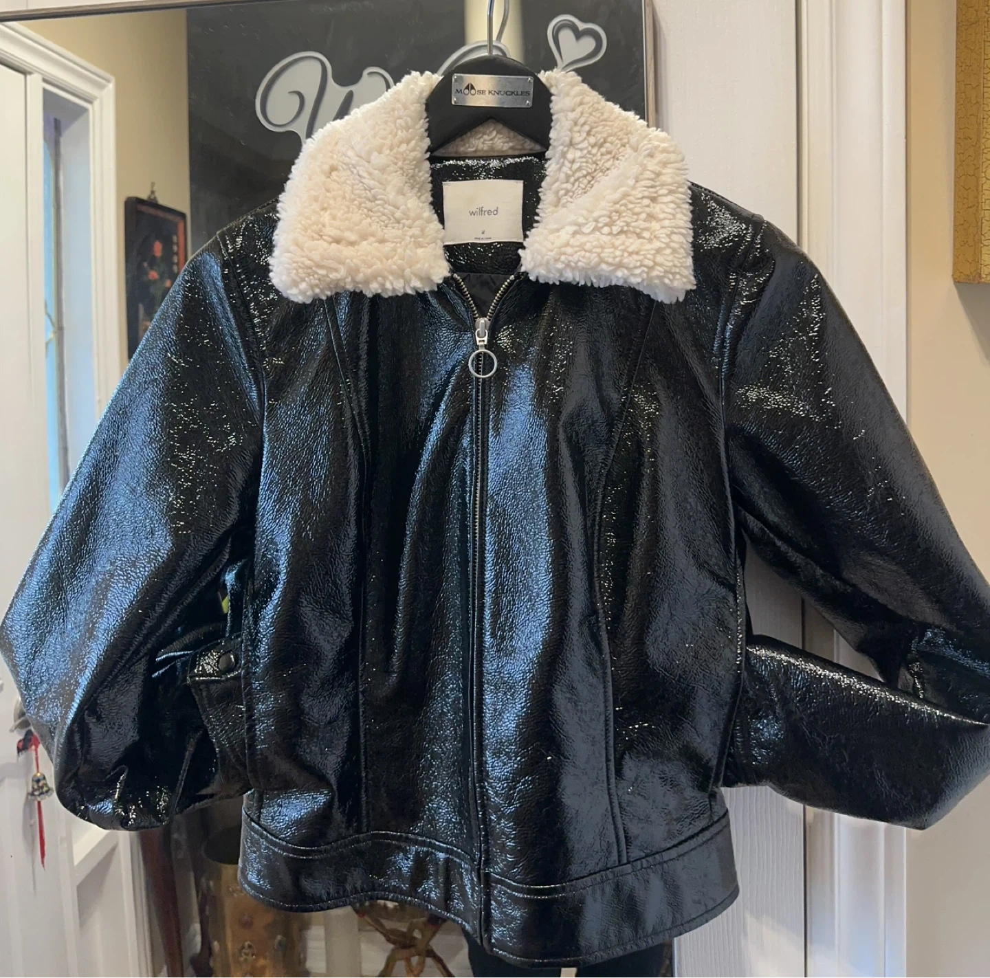 This stylish brand new without tag Wilfred jacket features a glossy black patent leather finish and a cozy sherpa collar. It's a size medium and comes with a zip-up front and convenient pockets. Perfect for adding a bit of edge to any outfit!