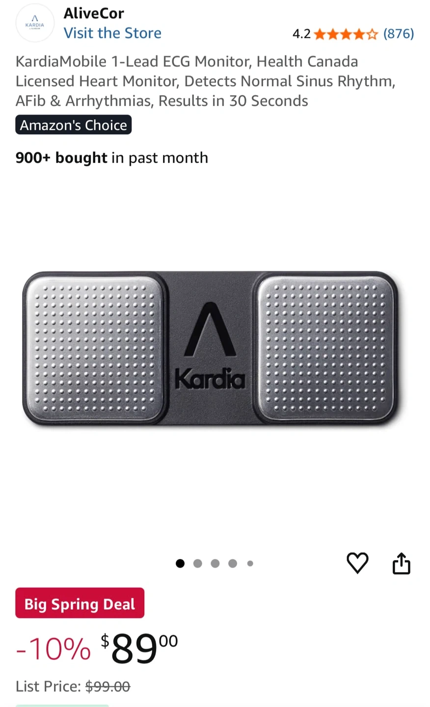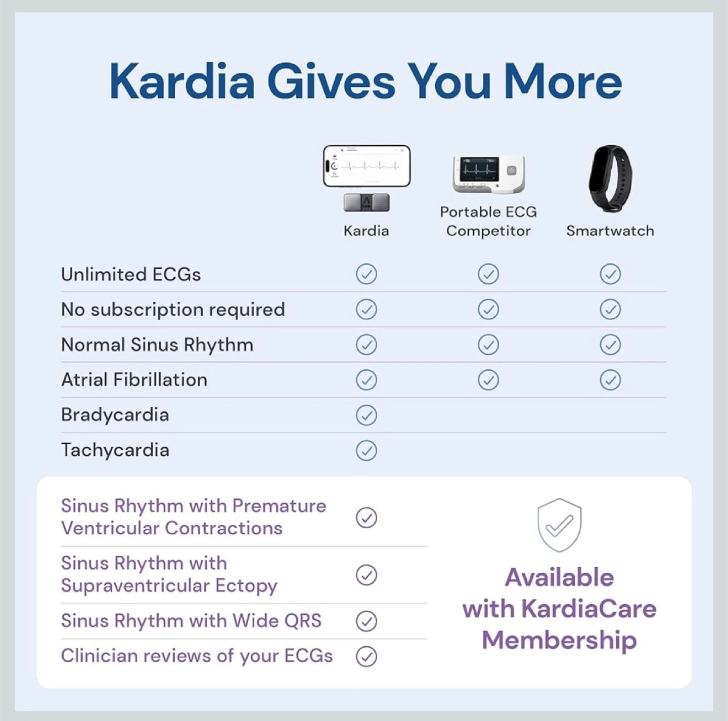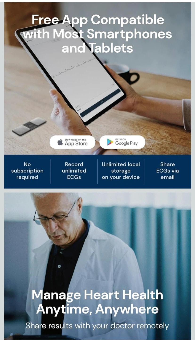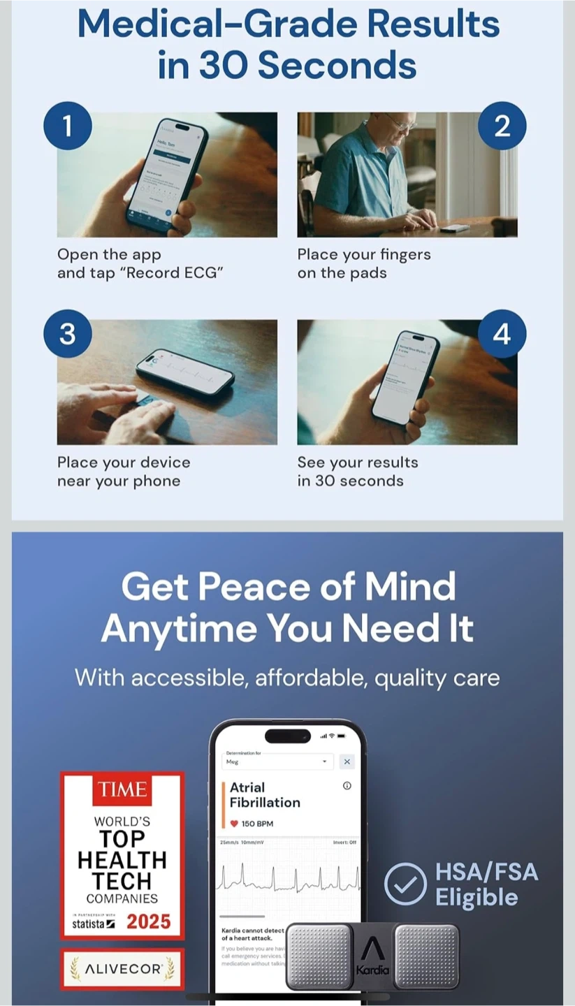 FDA-cleared mobile EKG that fits in your pocket. Detects AFib or Normal Rhythm in just 30 seconds. Model: AC-009. Includes quick start guide.