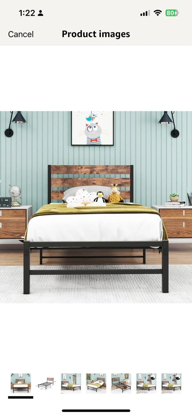 This metal platform bed frame features a rustic wood headboard. It offers a sturdy construction with a slatted support system. This bed frame is ideal for a modern or farmhouse-style bedroom.