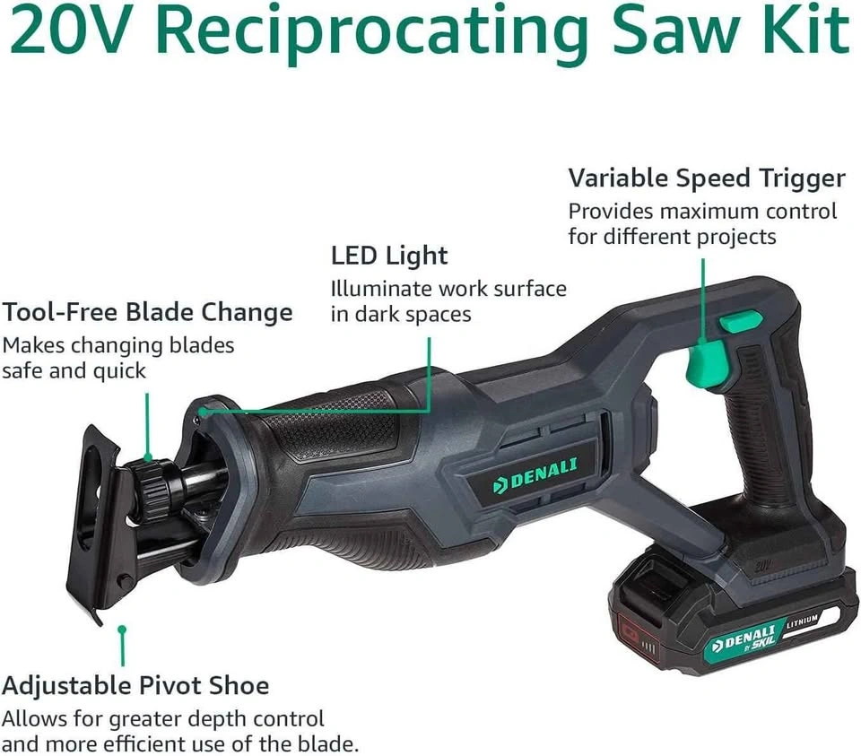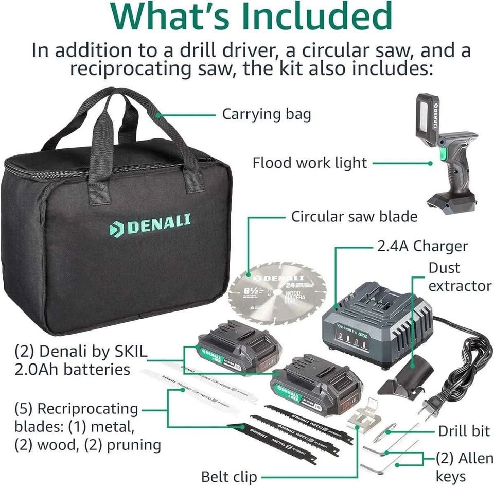 Complete Denali by SKIL 20V 4-in-1 kit — everything you need for construction, DIY, or home improvement. High-performance, cordless, and convenient. Includes: 20V Drill Driver 20V Circular Saw 20V Reciprocating Saw 20V Flood Work Light (2) 2.0Ah Batteries + Fast Charger (5) Reciprocating Blades (metal, wood, pruning) Circular Saw Blade, Dust Extractor, Belt Clip, Allen Keys, Drill Bit Carrying Bag Features: Powerful 20V system compatible across all Denali by SKIL tools LED lights for better visibility in low light Variable speed and 2-speed drill toggle for precision control Compact and ergonomic design Perfect for professionals or DIY users Condition: Brand new, pulled from a liquidation pallet Price: $240 (Retail: $399–$449)