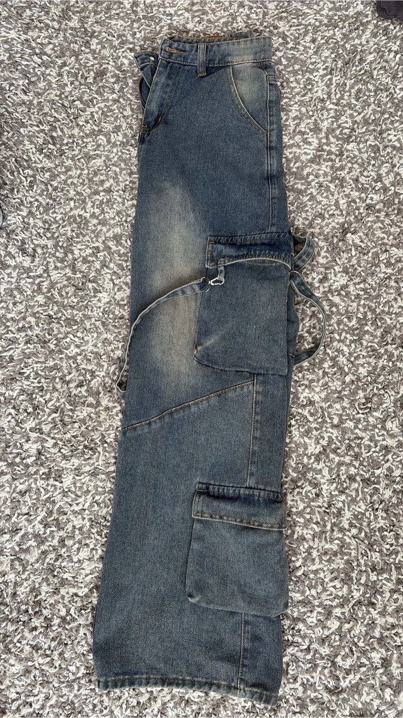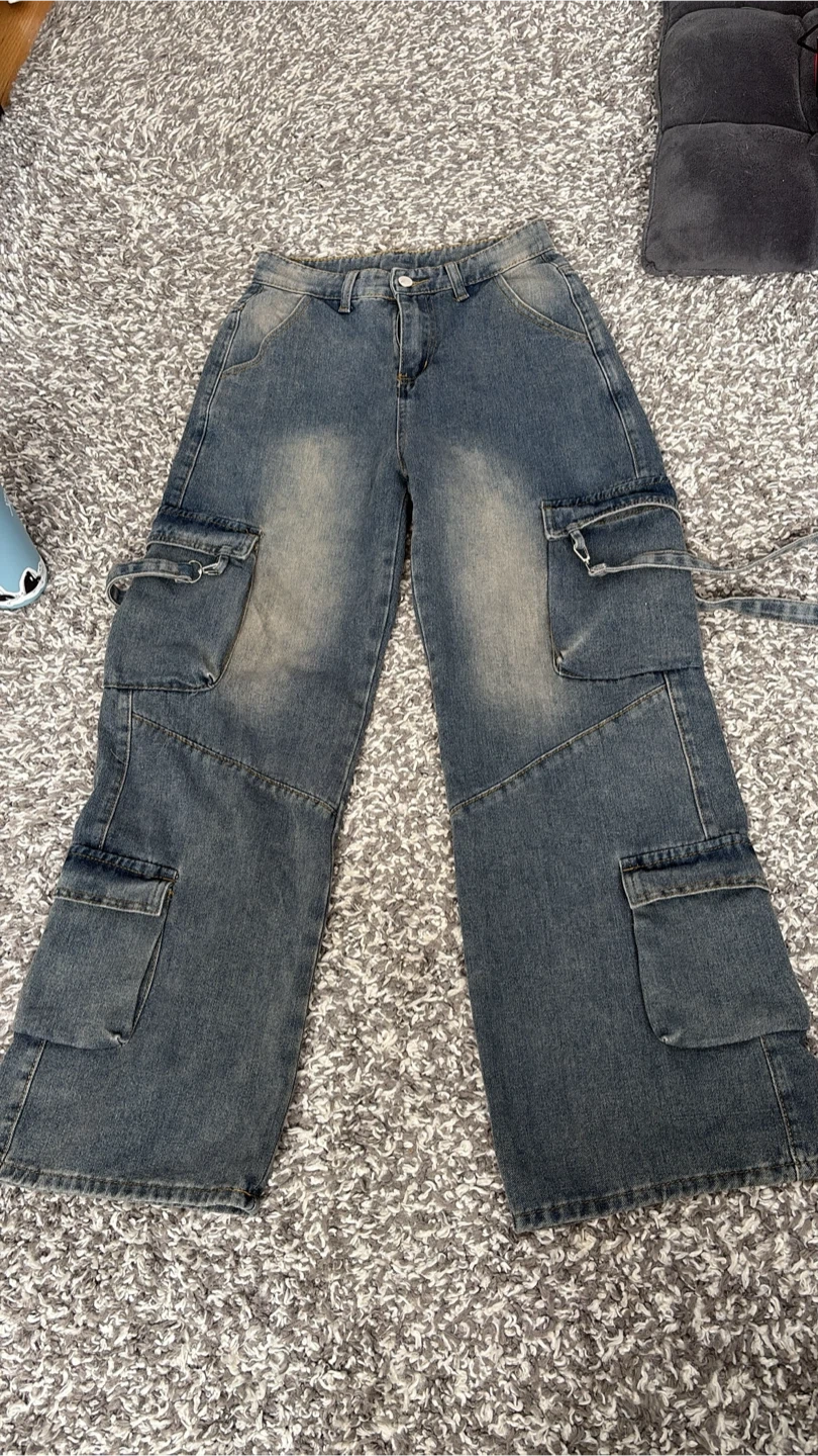 Selling a pair of denim cargo pants. They're in great condition and ready for a new home! The pants feature a stylish design with multiple cargo pockets, perfect for a casual and functional look. They are made of denim.