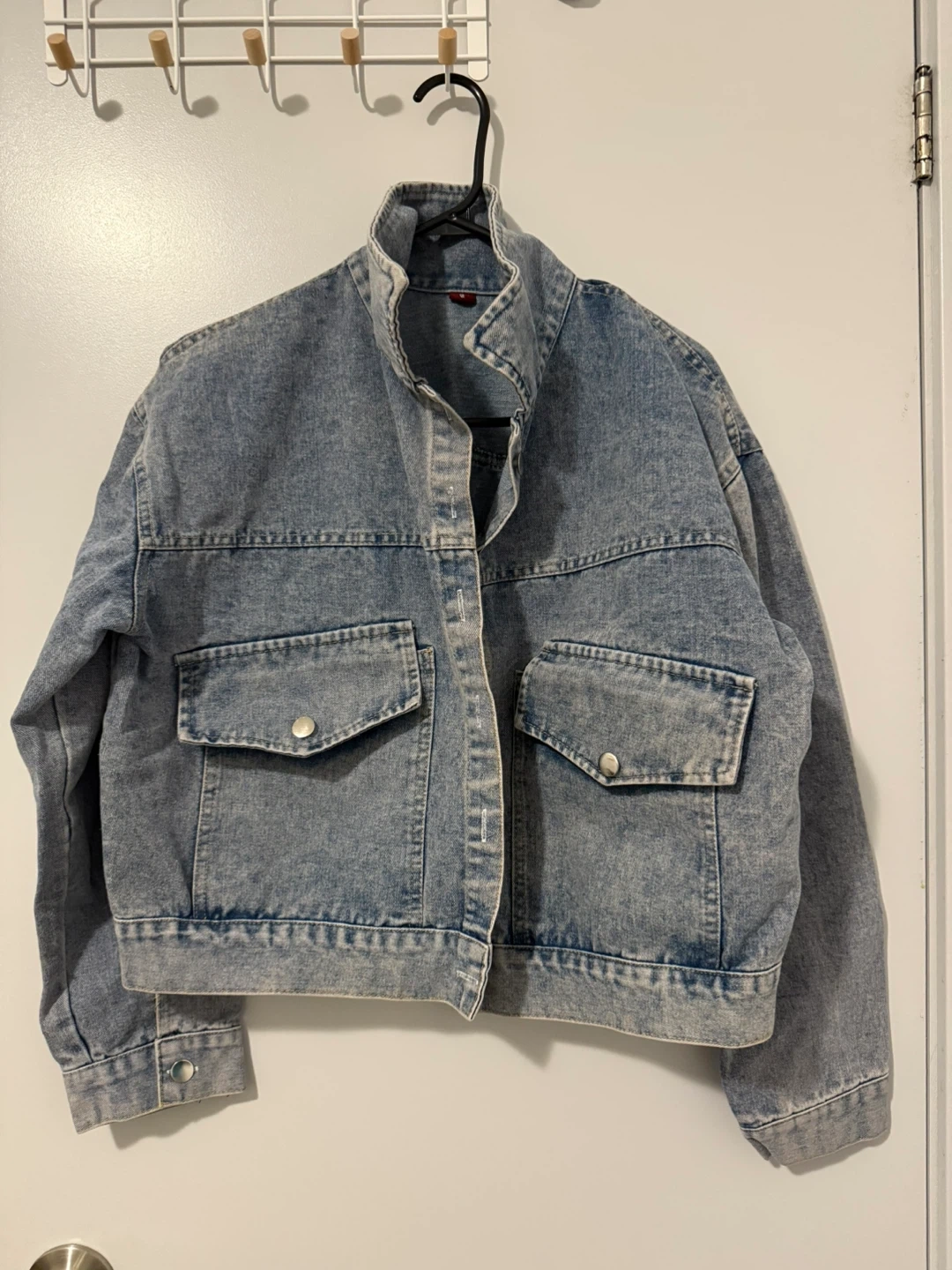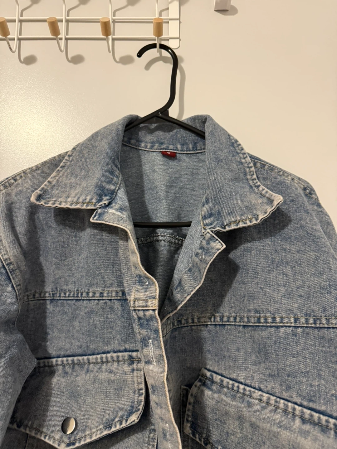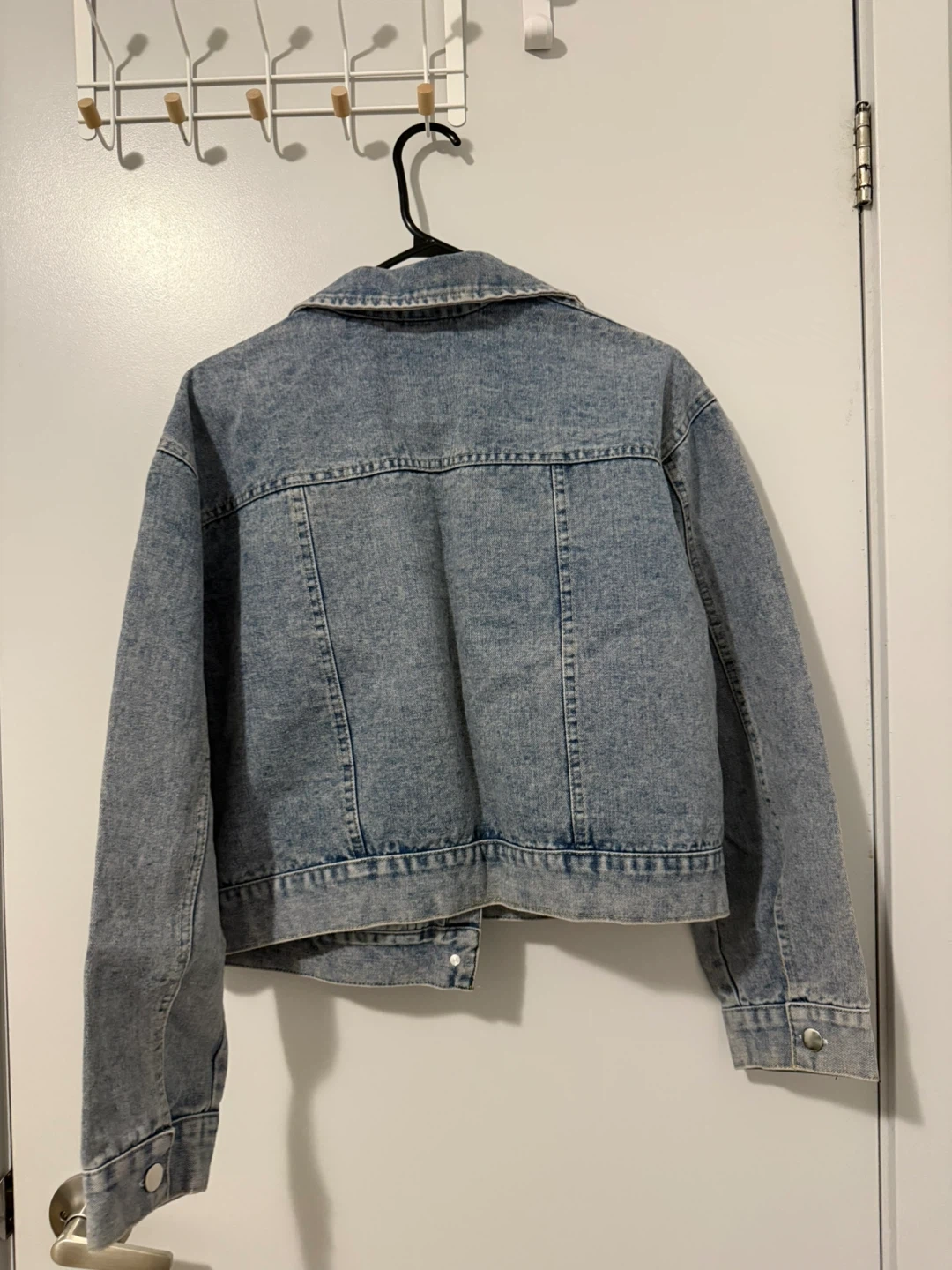 Here's a gently used denim jacket in a light wash. It's a classic piece that can be dressed up or down. Perfect for layering!