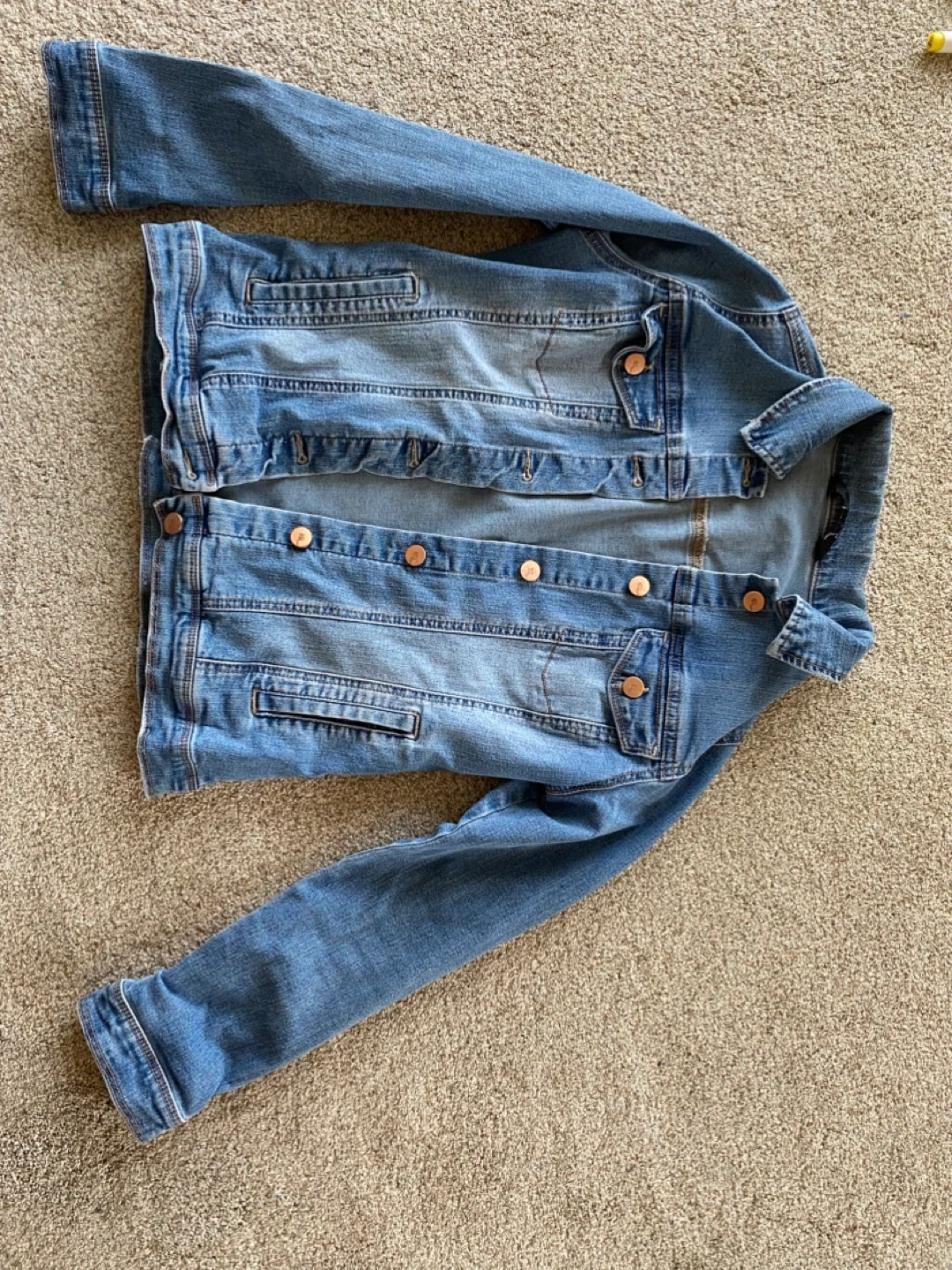 Denim jacket in size medium! It's a light wash denim with copper-colored buttons. Great for layering or wearing on its own during warmer weather