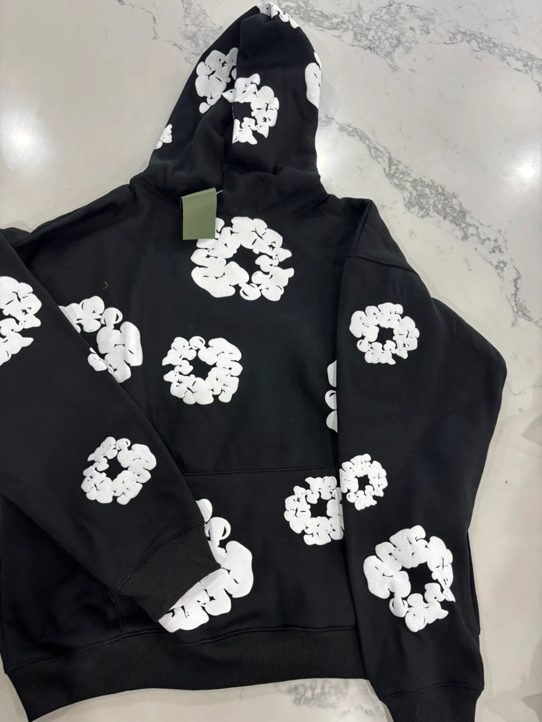 Selling a Denim Tears hoodie from their African Diaspora Goods line. It's a size medium and features a unique floral design on a black background. The hoodie is in great condition and ready for a new home!