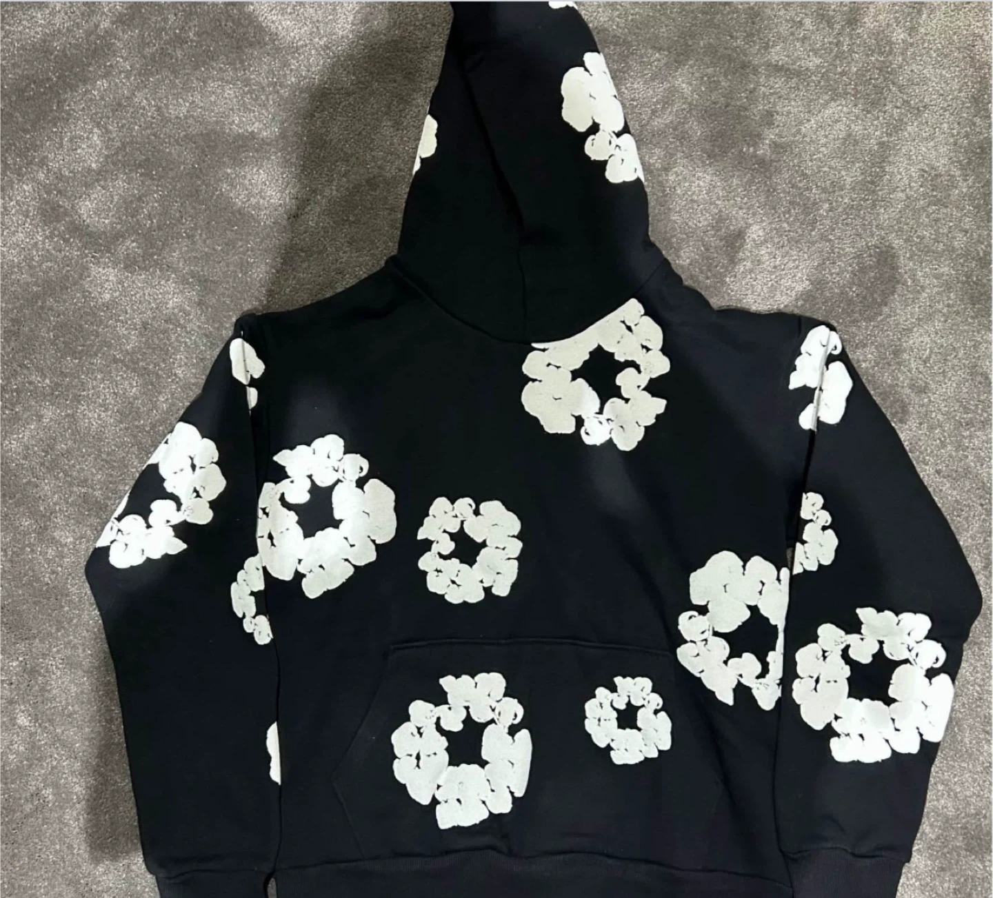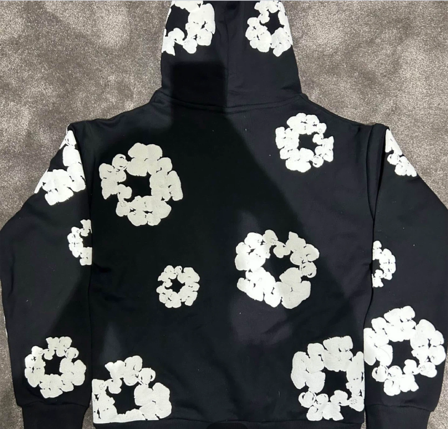 29A cozy black hoodie featuring a unique white floral design. It's in great condition and ready to keep you warm and stylish!