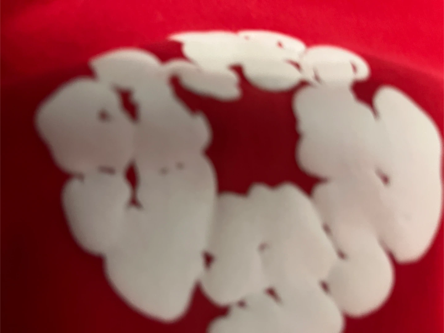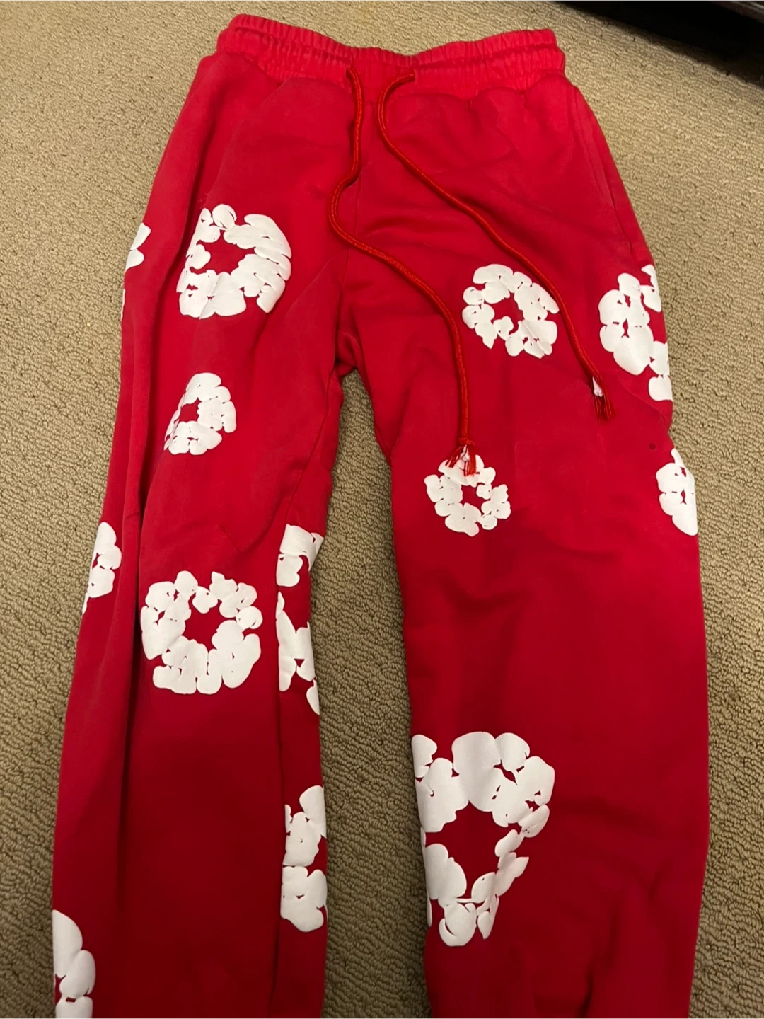 Selling a pair of Denim Tears sweatpants in red. They are a size medium and feature a unique floral design. There is a small defect on the pants, as seen in the pictures