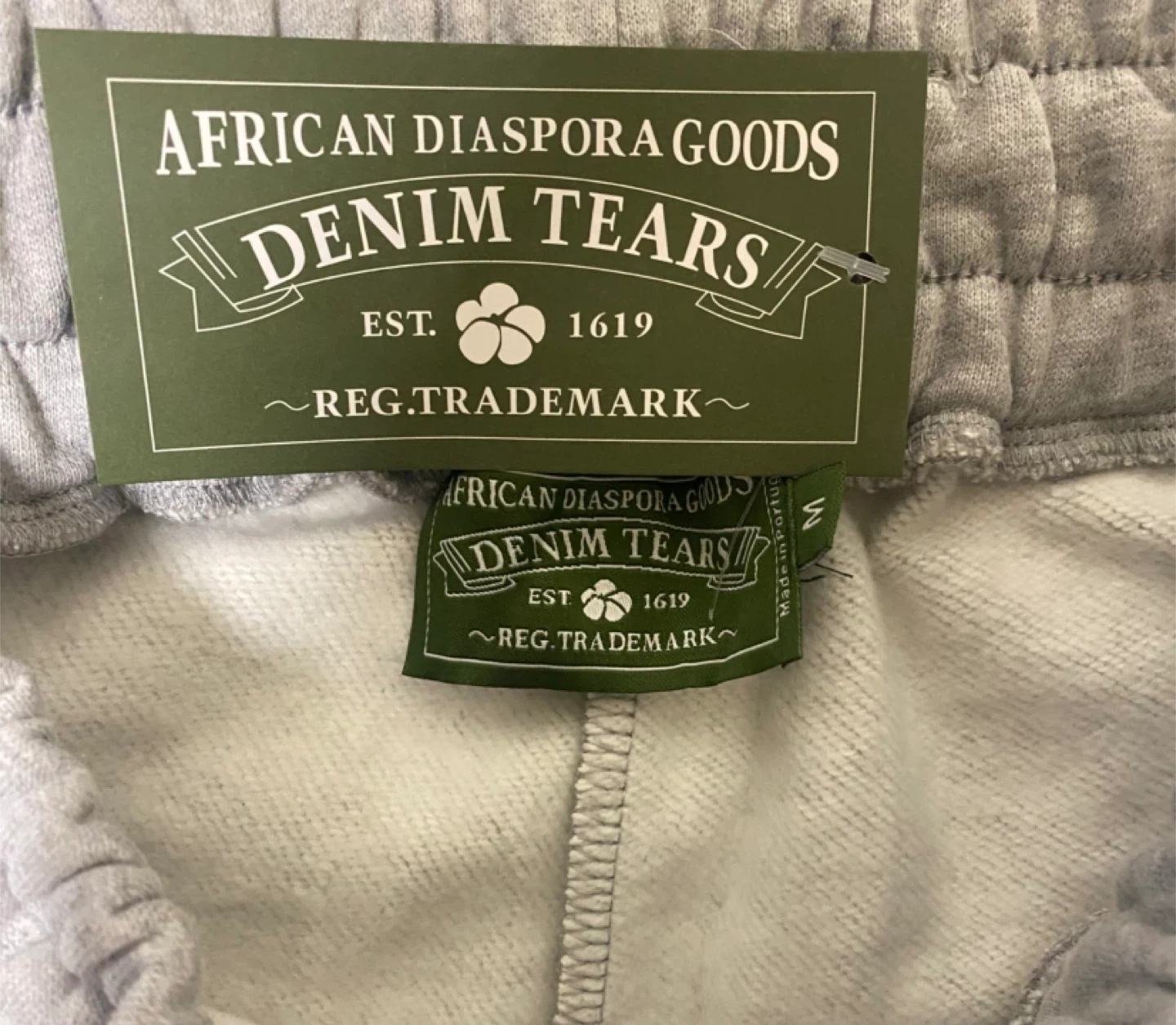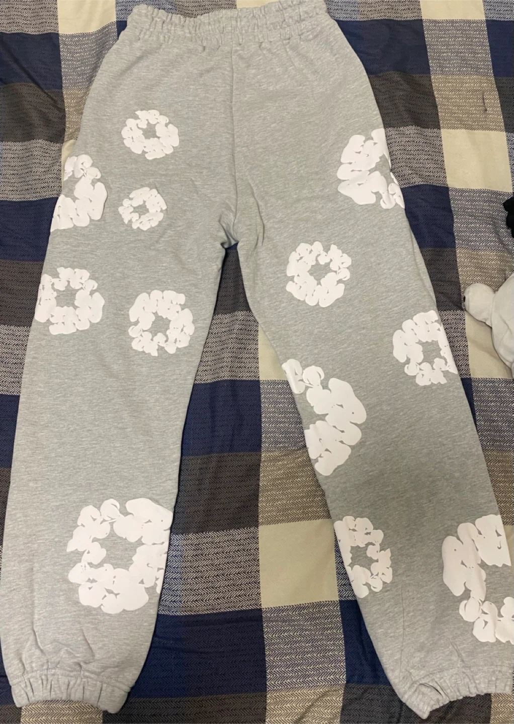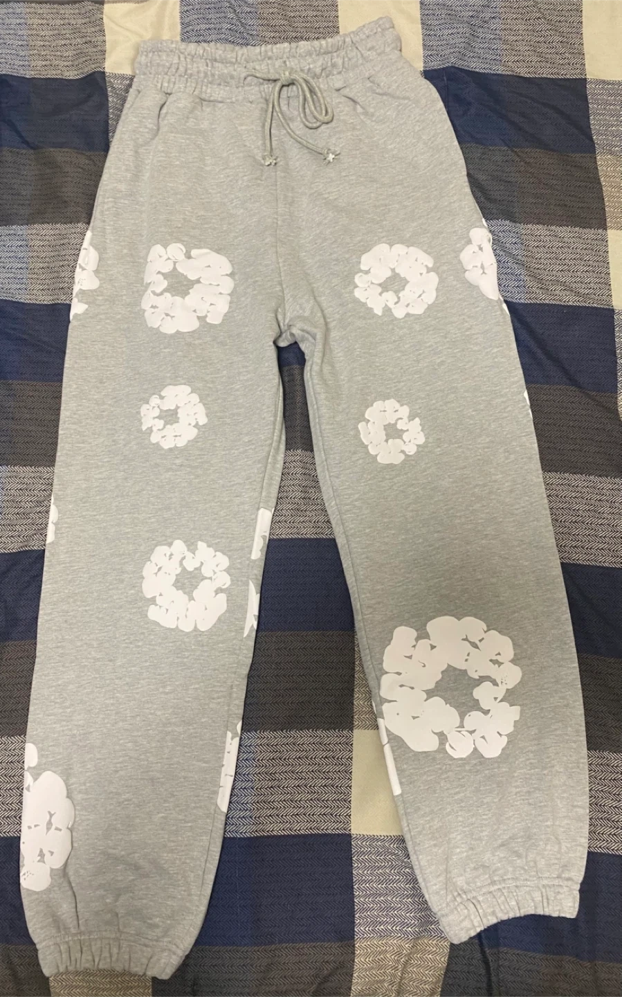 21Cozy Denim Tears sweatpants in a size medium! They feature a unique floral design and are made from comfortable materials. Perfect for lounging or casual outings. Check out the photos for details
