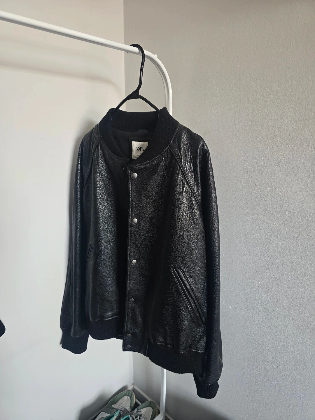 A black faux leather bomber jacket from ZARA. It's got a snap-button closure and ribbed cuffs and hem. This jacket is great for a casual look!