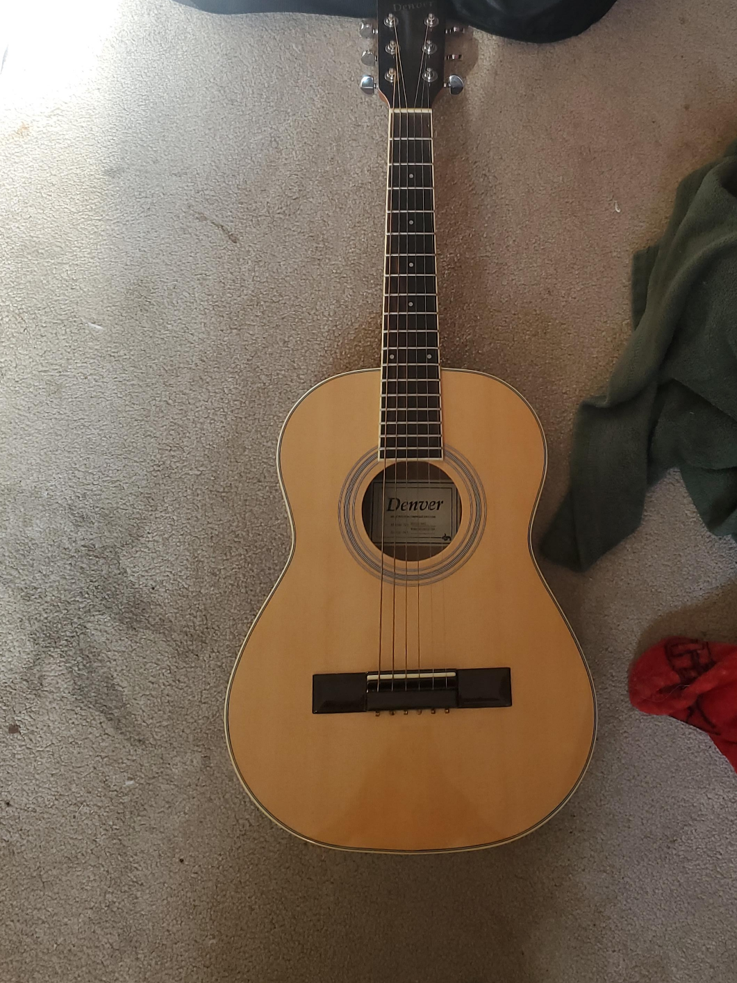 Selling a Denver acoustic guitar. It's in good condition and ready for a new home. Perfect for beginners or anyone looking for a smaller-sized guitar to practice with