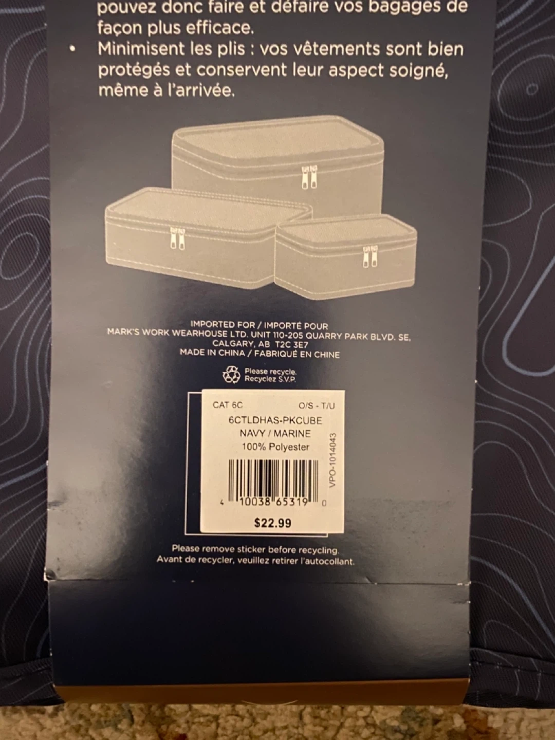 106Keep your luggage organized with this set of 3 Denver Hayes packing cubes! They help maximize space and keep your items neatly separated. - Includes 3 cubes of different sizes - Colour: Navy/Marine - Large: 46 cm x 35 cm x 12 cm - Medium: 37 cm x 26 cm x 11 cm - Small: 28 cm x 19 cm x 8 cm - Made of 100% Polyester - Originally bought for $22.99