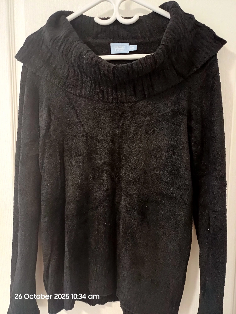 15Selling a cozy black sweater from Denver Hayes! It's a size medium and features a stylish cowl neck. Perfect for staying warm and looking great this fall and winter