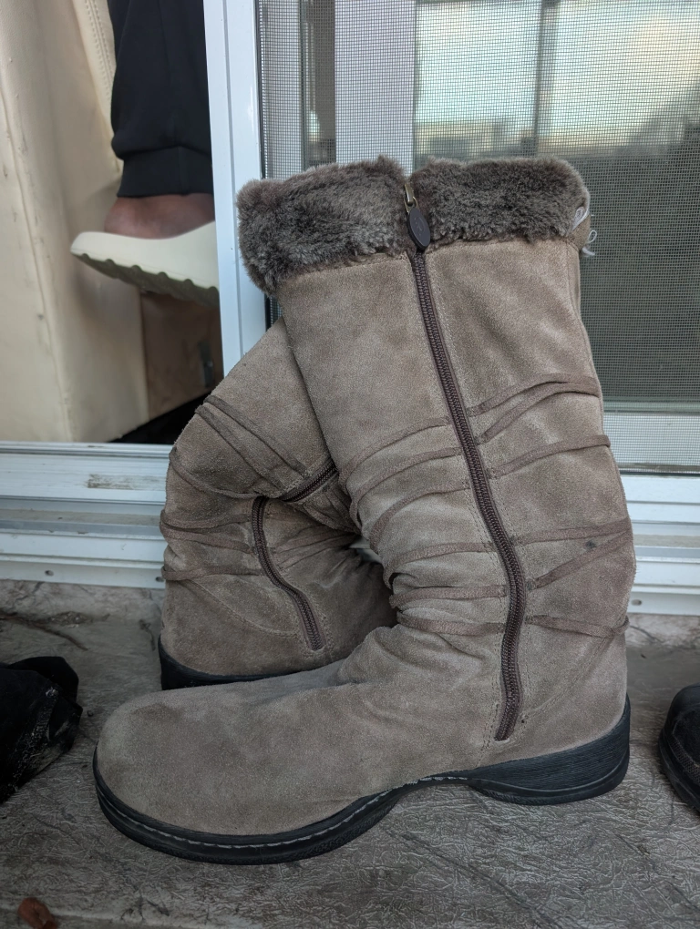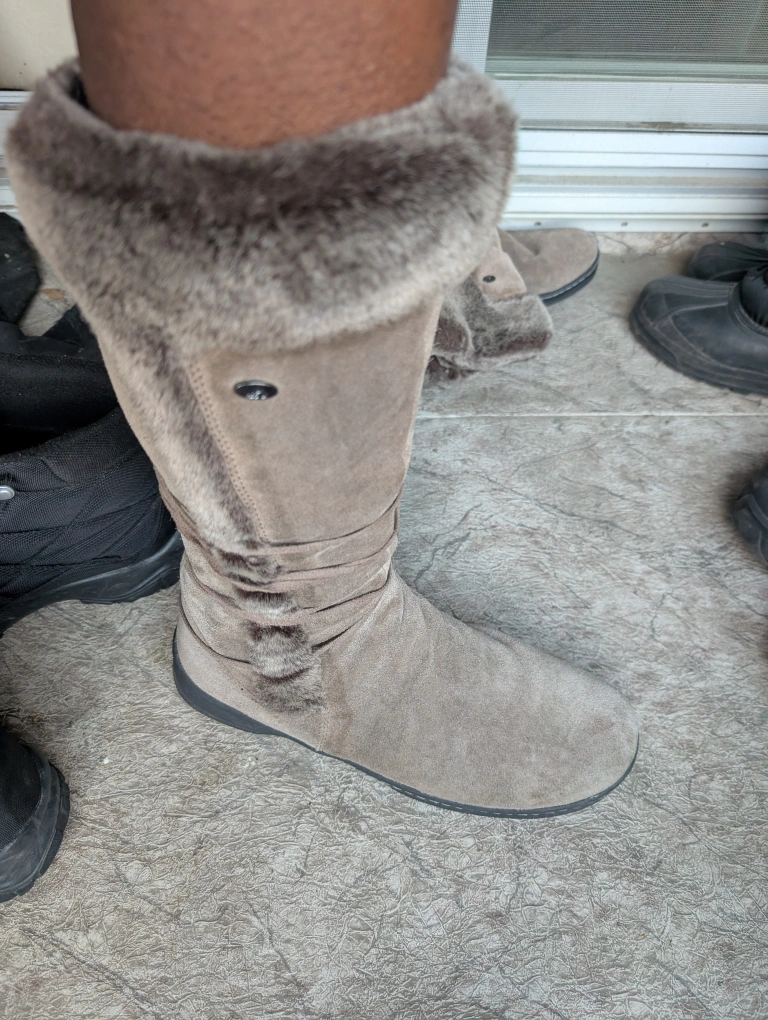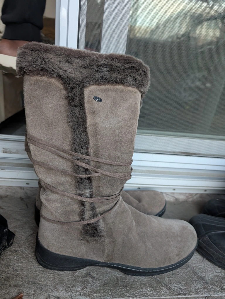 98Used twice Cozy Denver Hayes taupe boots, perfect for the Canadian winter! These boots are a size 11M US or 9 UK and feature a faux fur trim and a comfortable sole. They're in great condition and ready for a new home!