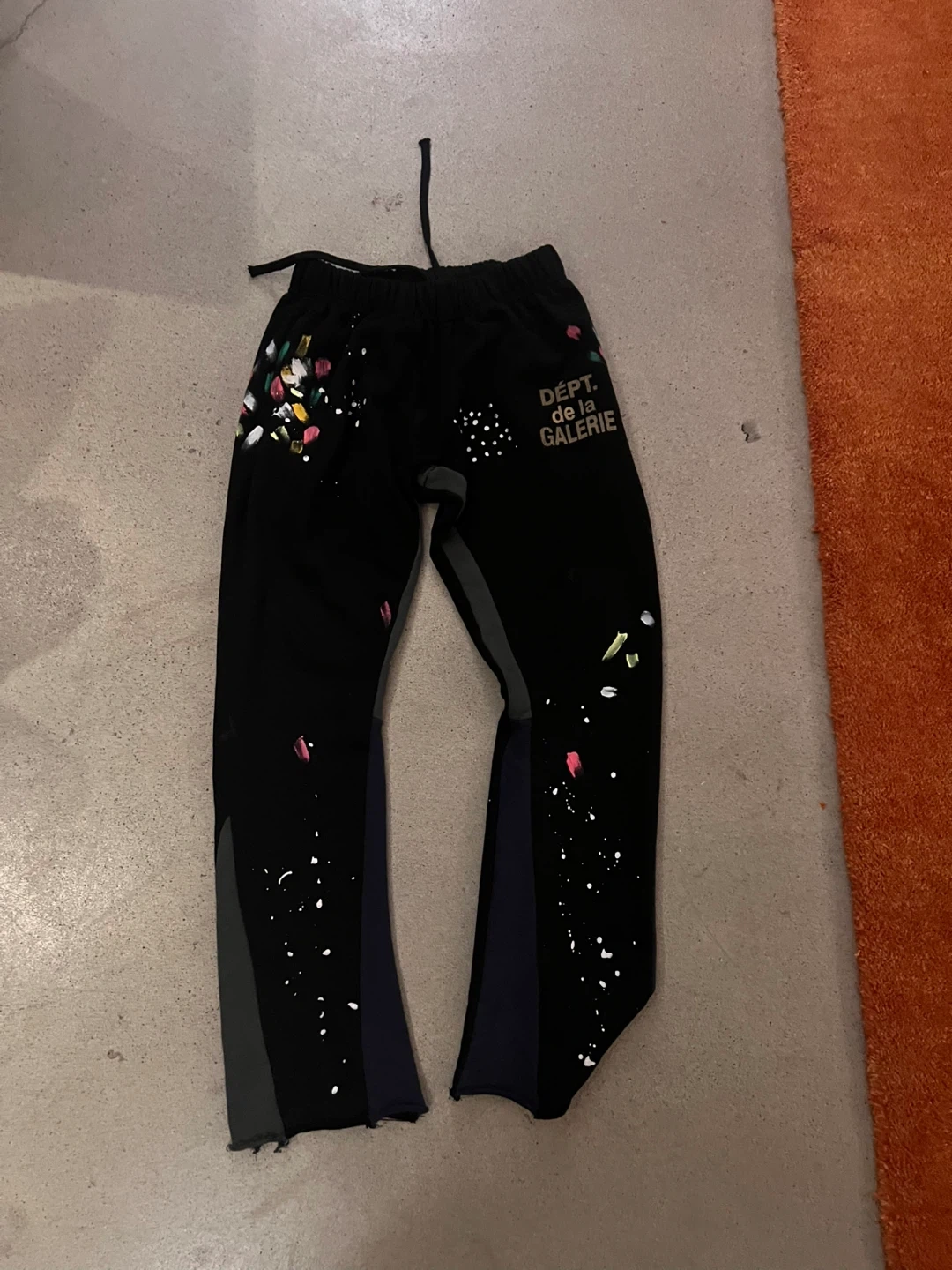 17Selling a pair of DEPT. de la GALERIE black pants. They have a unique design with paint splatter and other artistic details. In used condition.