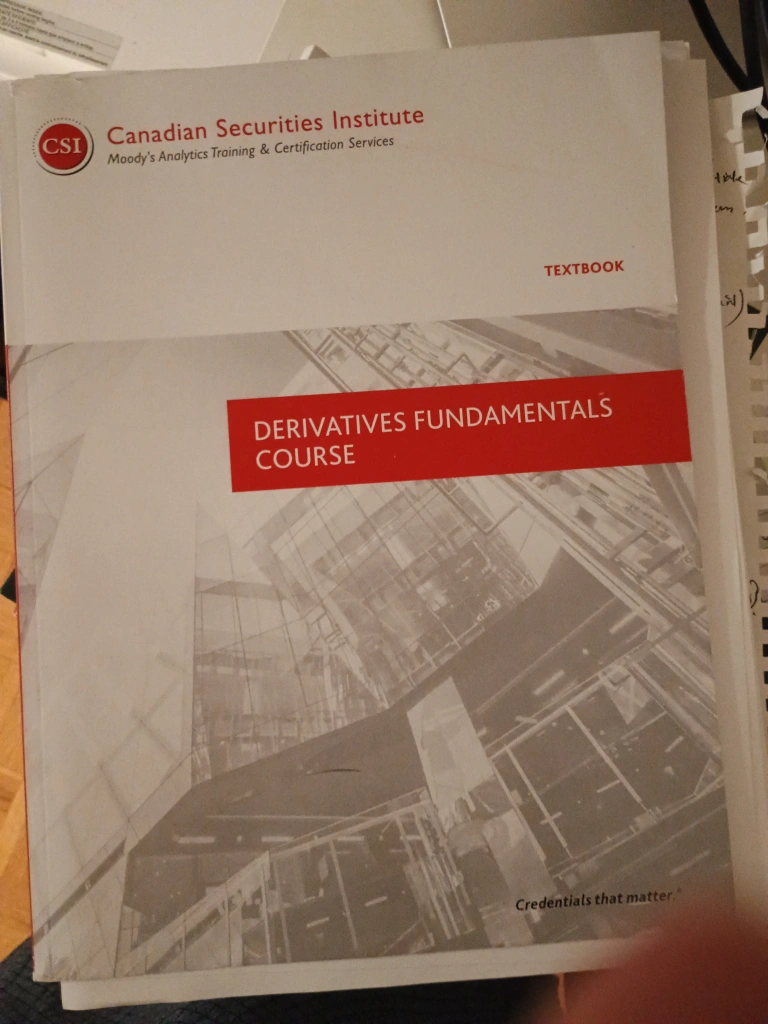 85Selling a textbook for the Derivatives Fundamentals Course by the Canadian Securities Institute. It's in good condition and ready for a new owner!