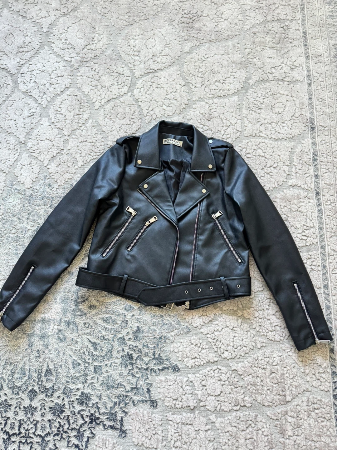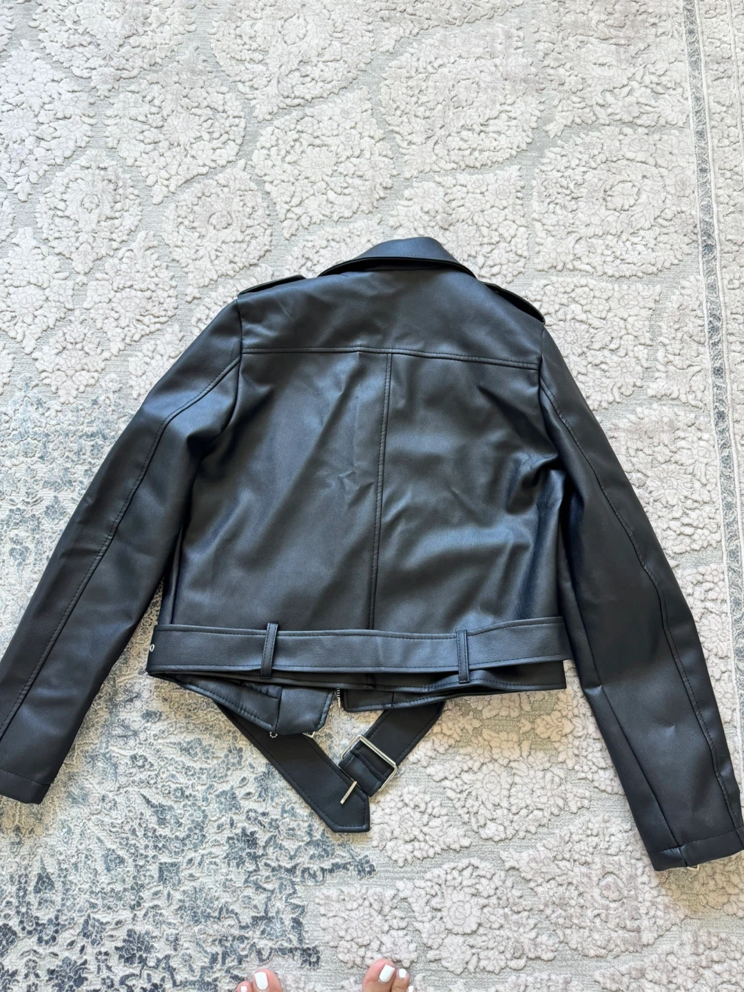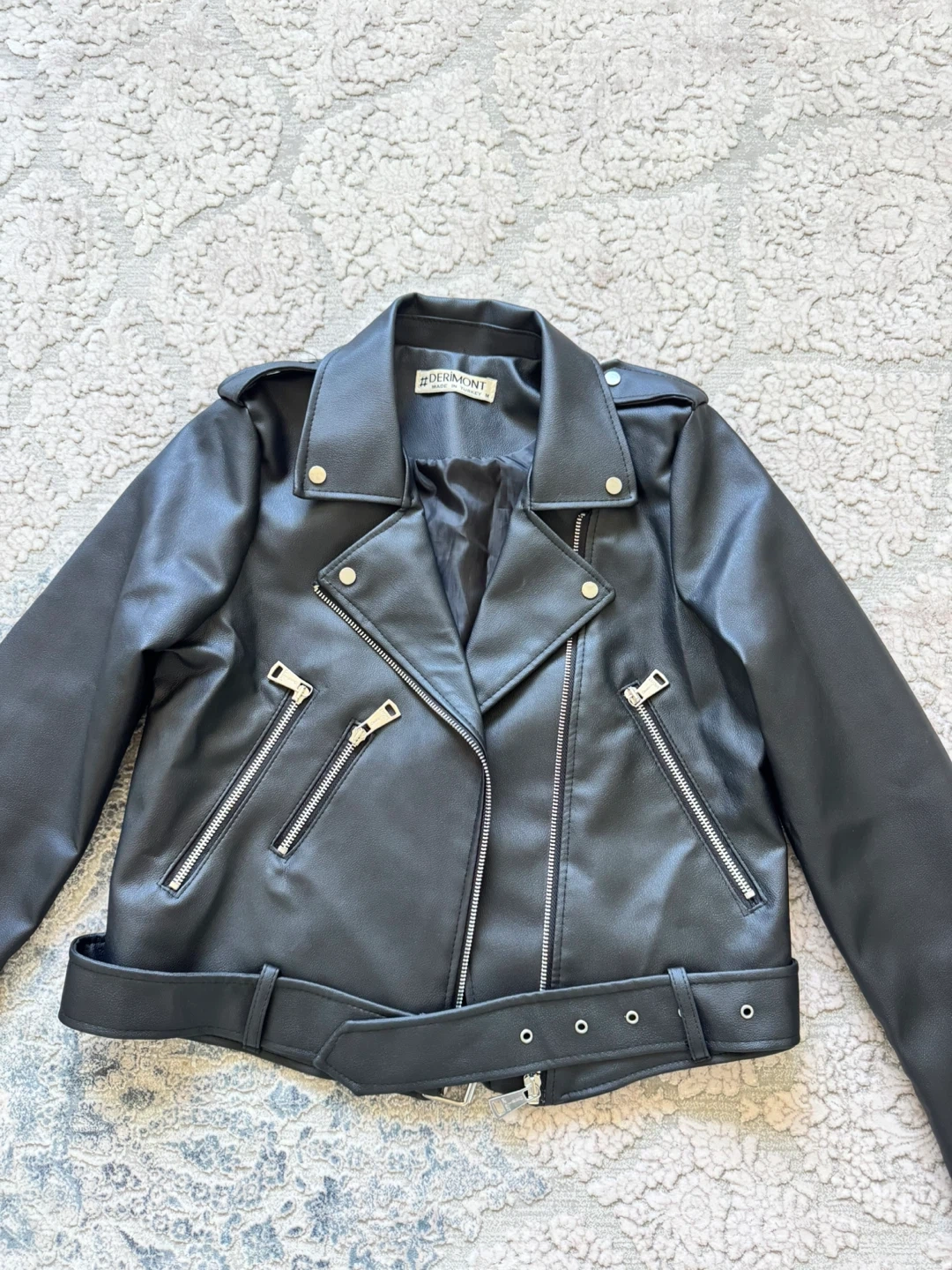 Here's a stylish black faux leather biker jacket from DERMONT! It's perfect for adding a bit of edge to any outfit. The jacket features classic biker detailing like zippers and a belted waist. It's in great condition and ready for a new home!