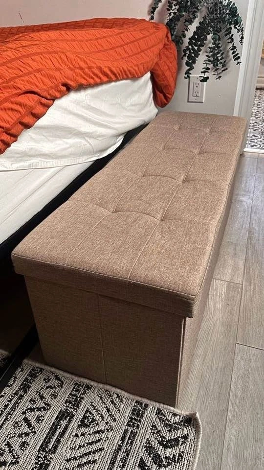 SONGMICS 110 cm storage ottoman bench in good condition. Great for extra seating and hidden storage. Folding design makes it easy to move and store. Spacious inside for blankets, shoes, etc. Works well in a bedroom, entryway, or living room. Pickup near King St.W and Dufferin. Message to arrange a time.