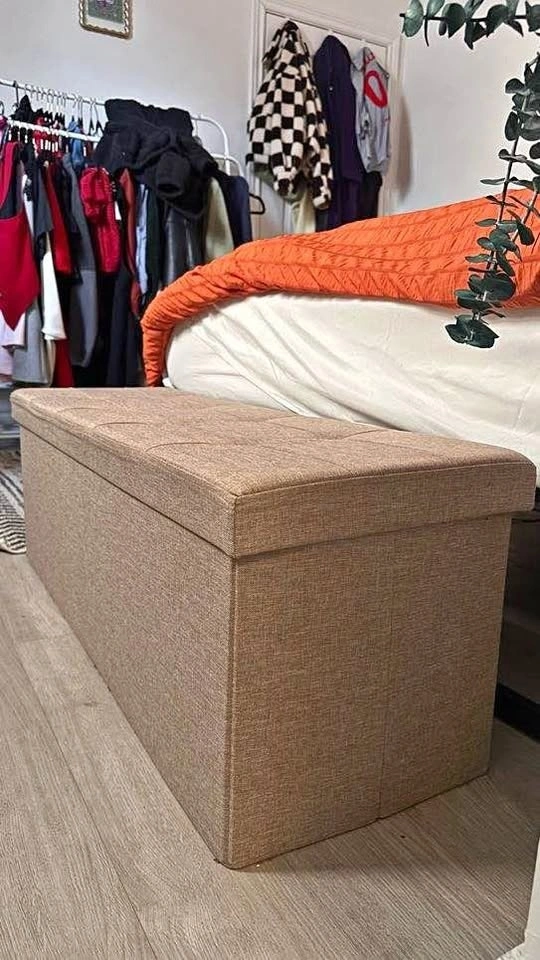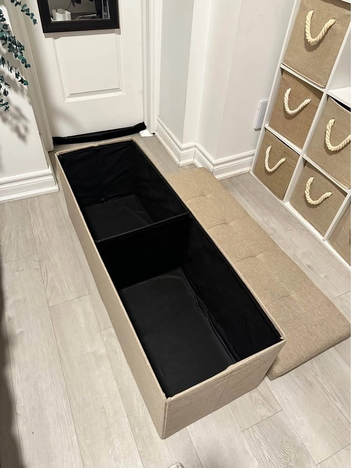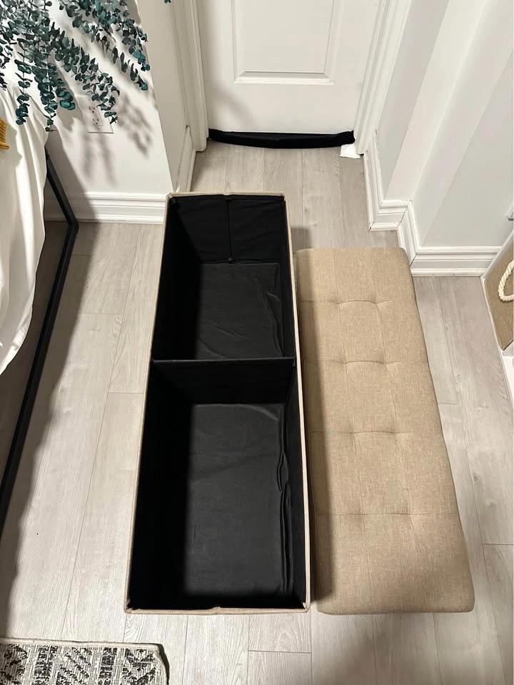 SONGMICS 110 cm storage ottoman bench in good condition. Great for extra seating and hidden storage. Folding design makes it easy to move and store. Spacious inside for blankets, shoes, etc. Works well in a bedroom, entryway, or living room. Pickup near King St.W and Dufferin. Message to arrange a time.