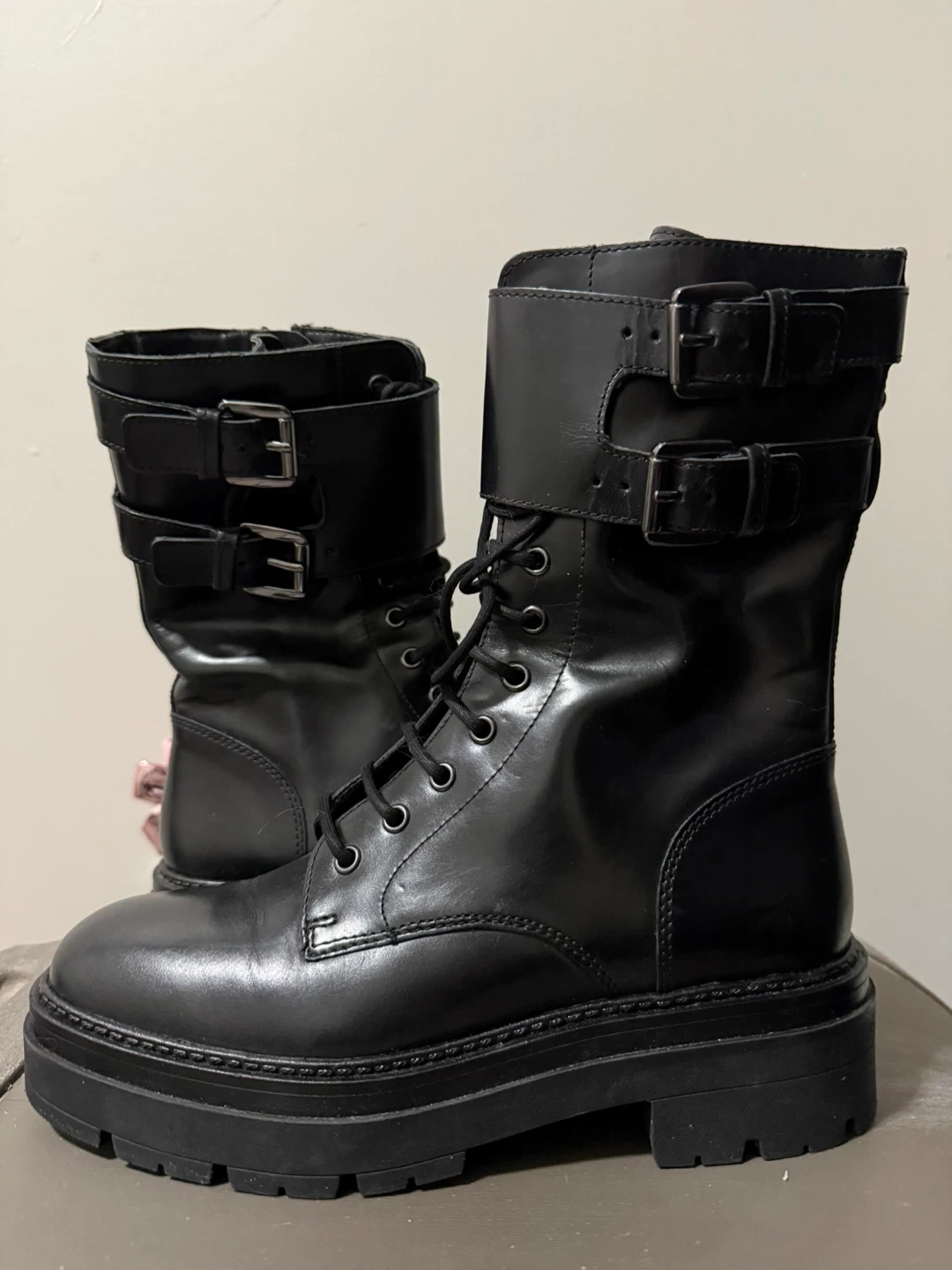 Black leather combat boots with lace-up front and buckle closures. They feature a chunky platform sole. Material is leather.