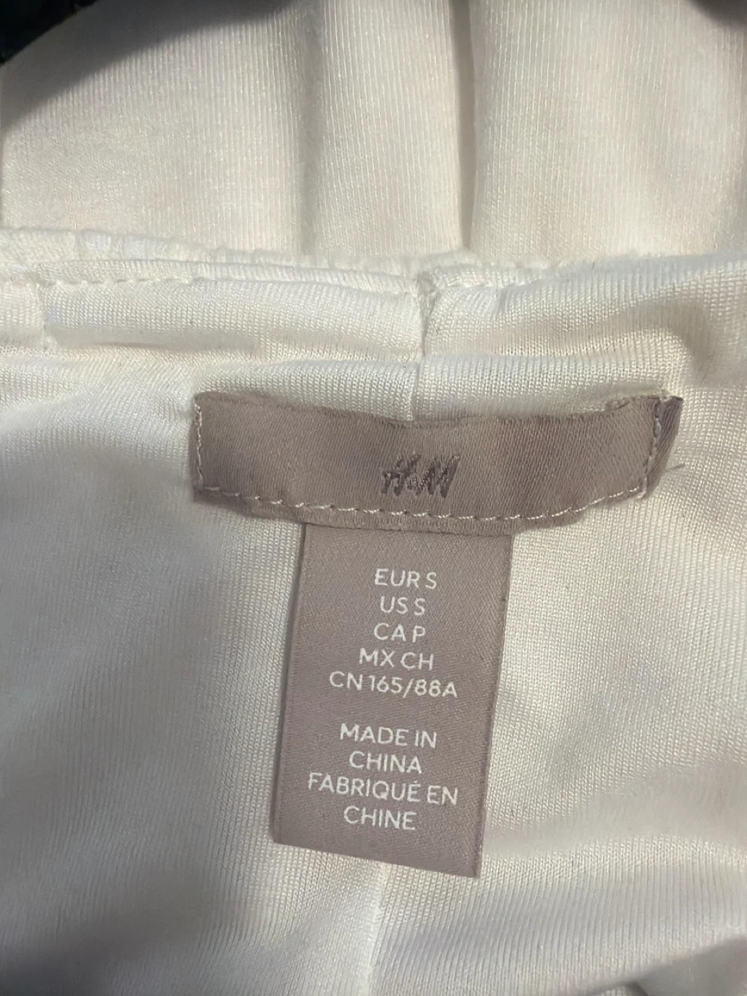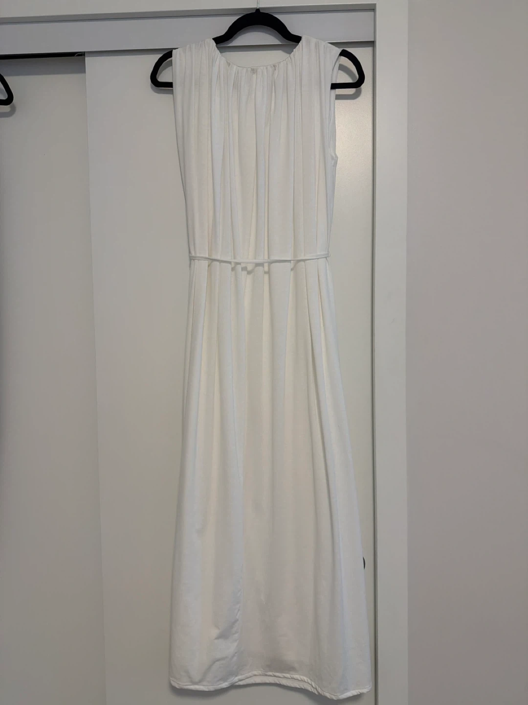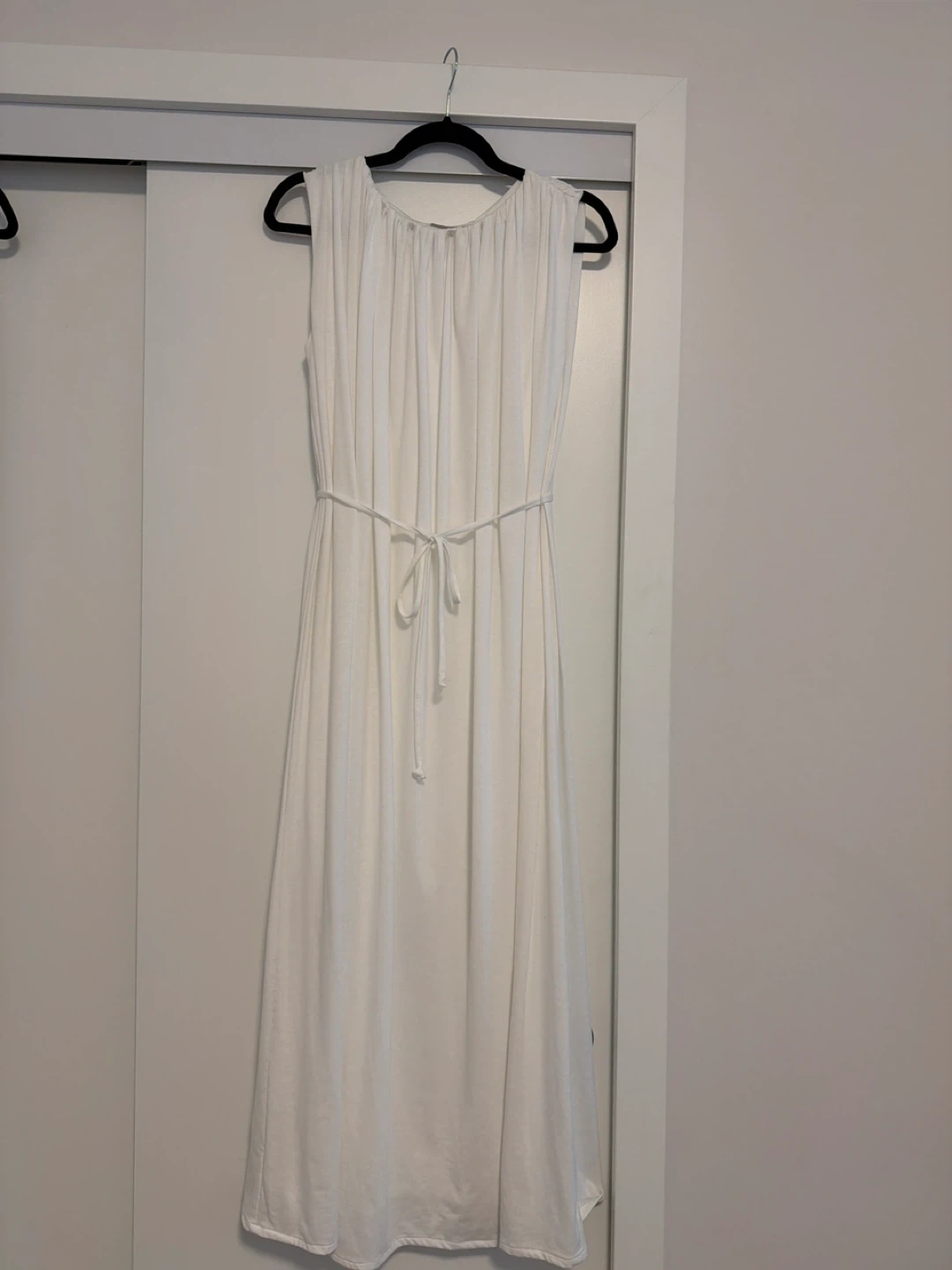 This H&M sleeveless maxi dress is white and comes in a size S. It has a tie-waist detail. The dress is made of a soft, comfortable fabric. Perfect for warmer weather or casual occasions!