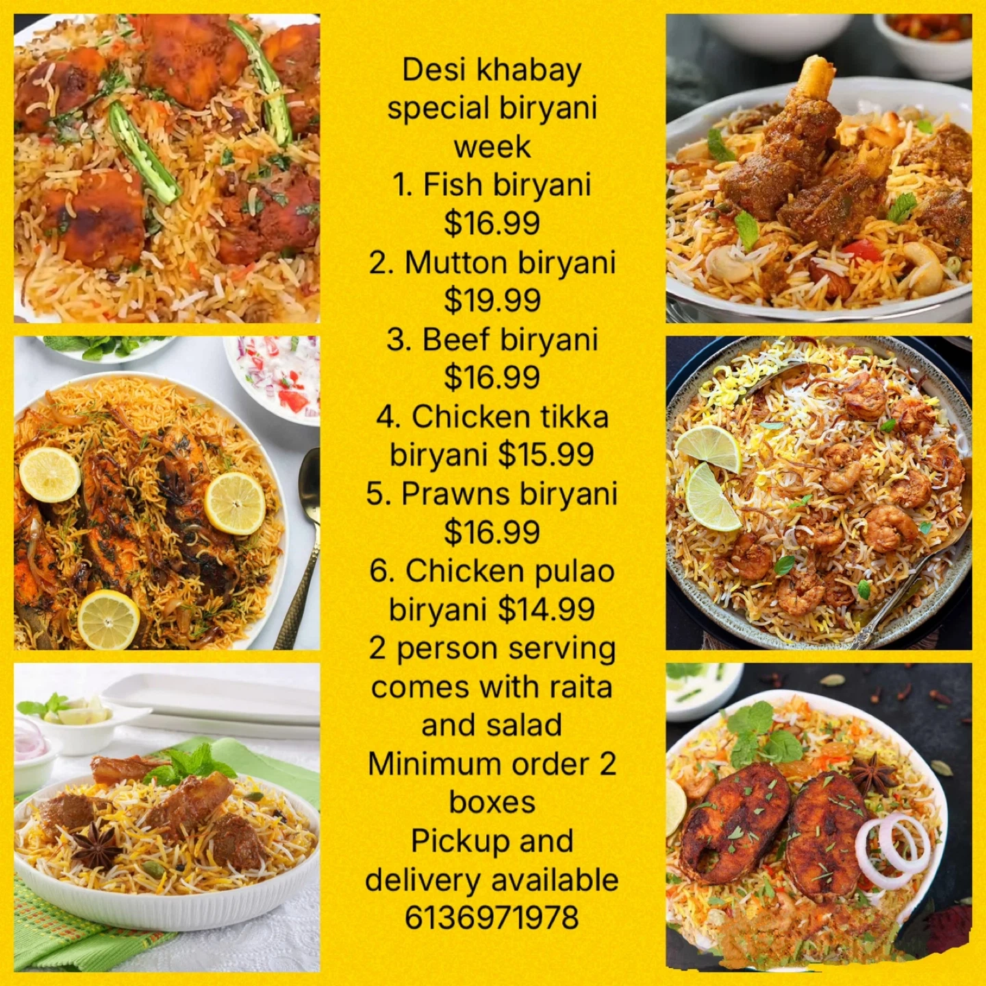 10Check out the special biryani menu from Desi Khabay! They have a variety of options including fish, mutton, beef, chicken tikka, prawns, and chicken pulao biryani. Each is a 2-person serving and comes with raita and salad. Pickup and delivery are available!