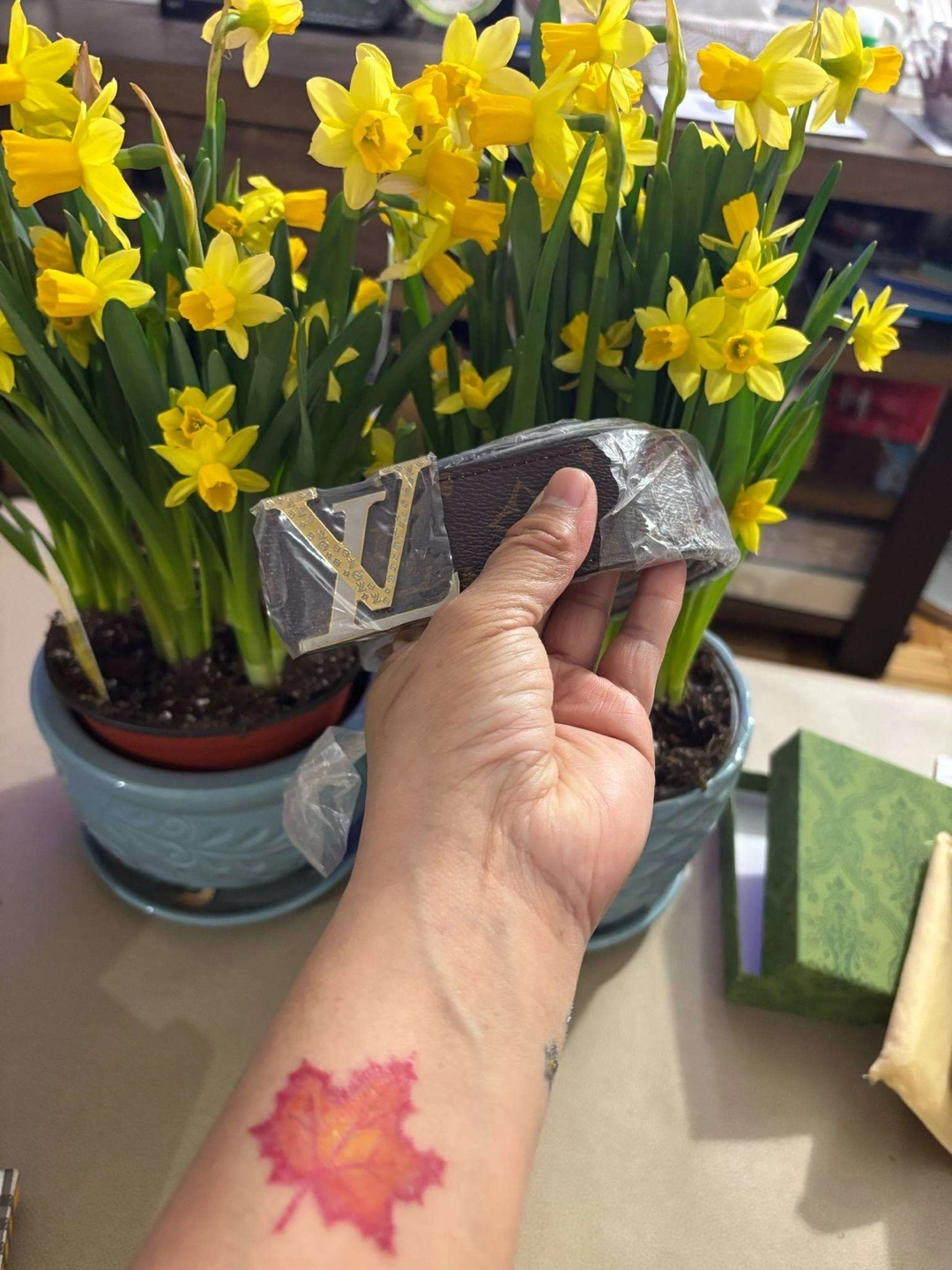 A stylish belt, still in packaging. Features a gold-coloured buckle. Would look lovely with your favourite pair of jeans.