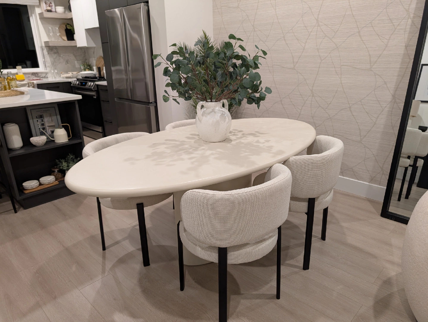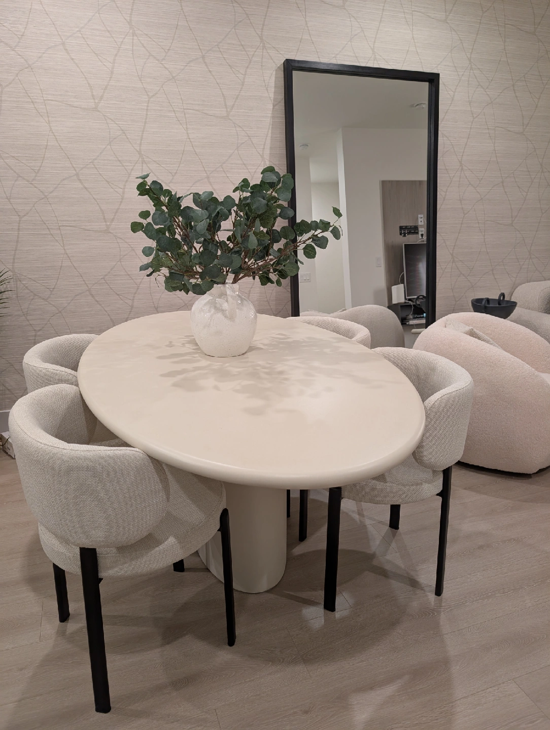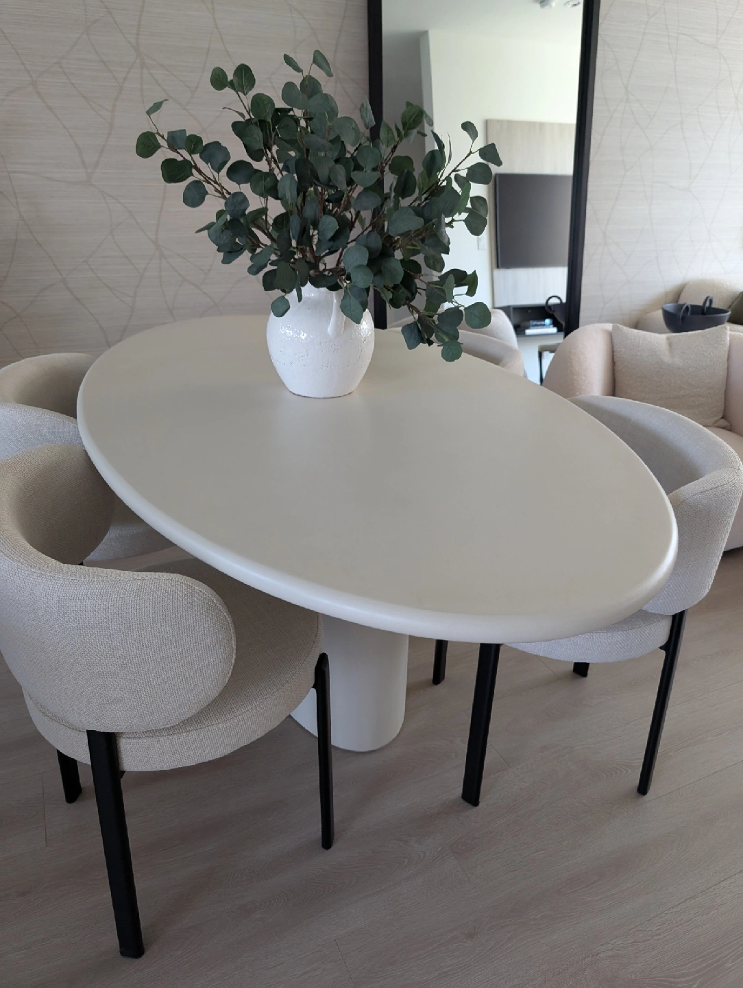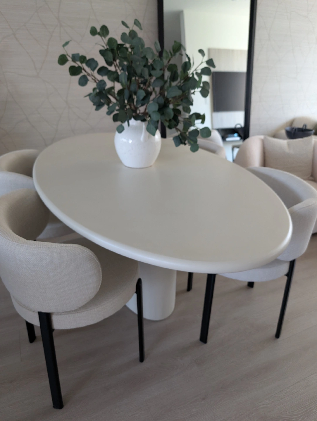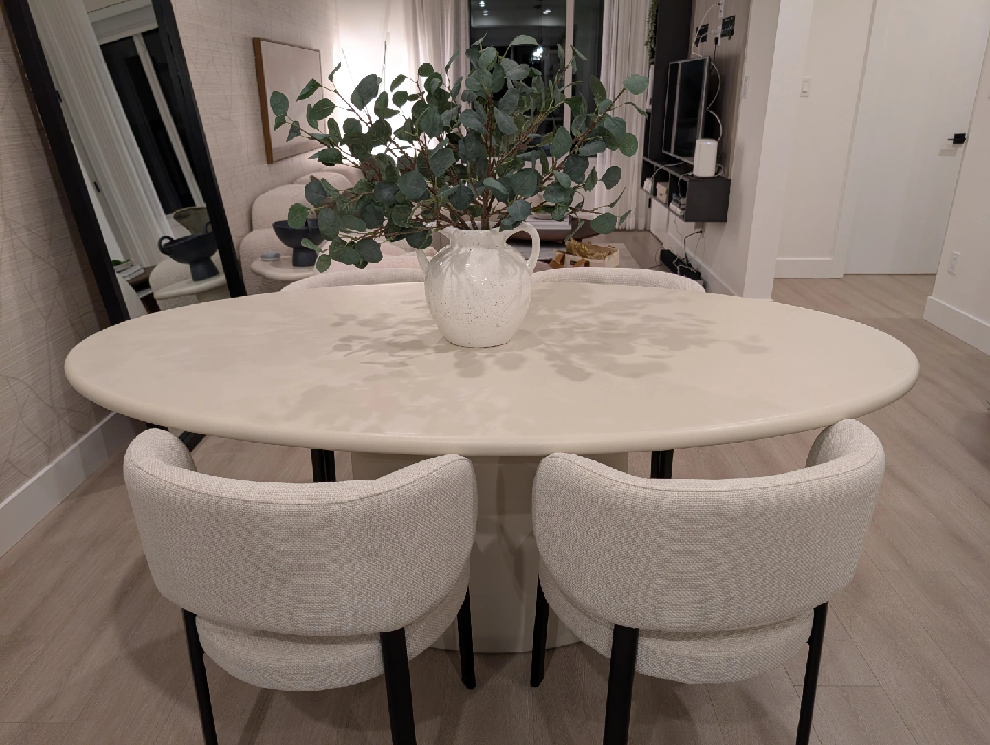 Selling a luxury dining set from our brand new display townhouse in Vancouver. This was used for staging only — never dined on, showroom condition. Set includes: The Table: Mobital “Tugg” 71" Oval Dining Table Finish: Ivory Tusk Microskin with Microskin base Dimensions: 71"L x 43"W x 30"H Original retail: $4,800+ CAD Note: Minor defect on the edge of the tabletop (see last image posted). The Chairs: 4 x Mobital “Lily” Upholstered Dining Chairs Color: Soft grey velvet / brushed metal legs Modern, comfortable and elegant Original retail: $1,060 CAD per pair / ~$2,100 total for 4 chairs (Retail value of the set plus taxes would be close $8,000 )