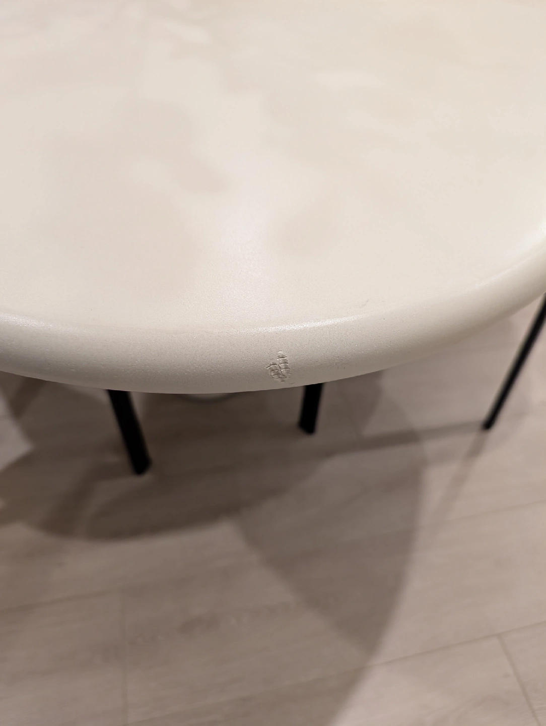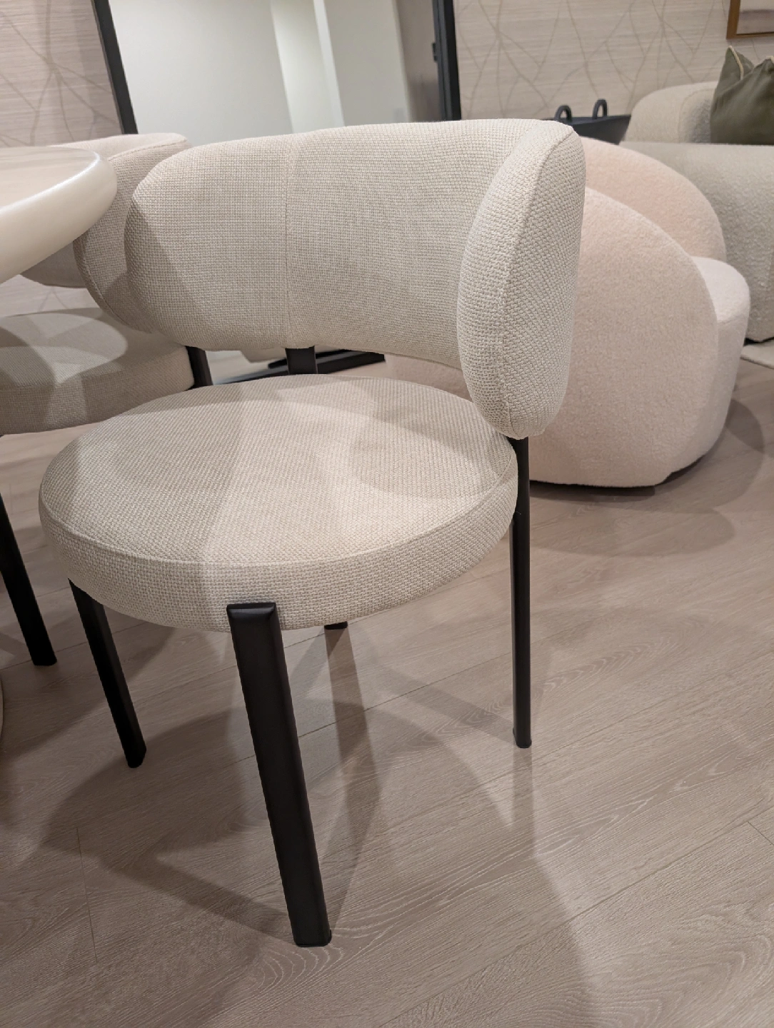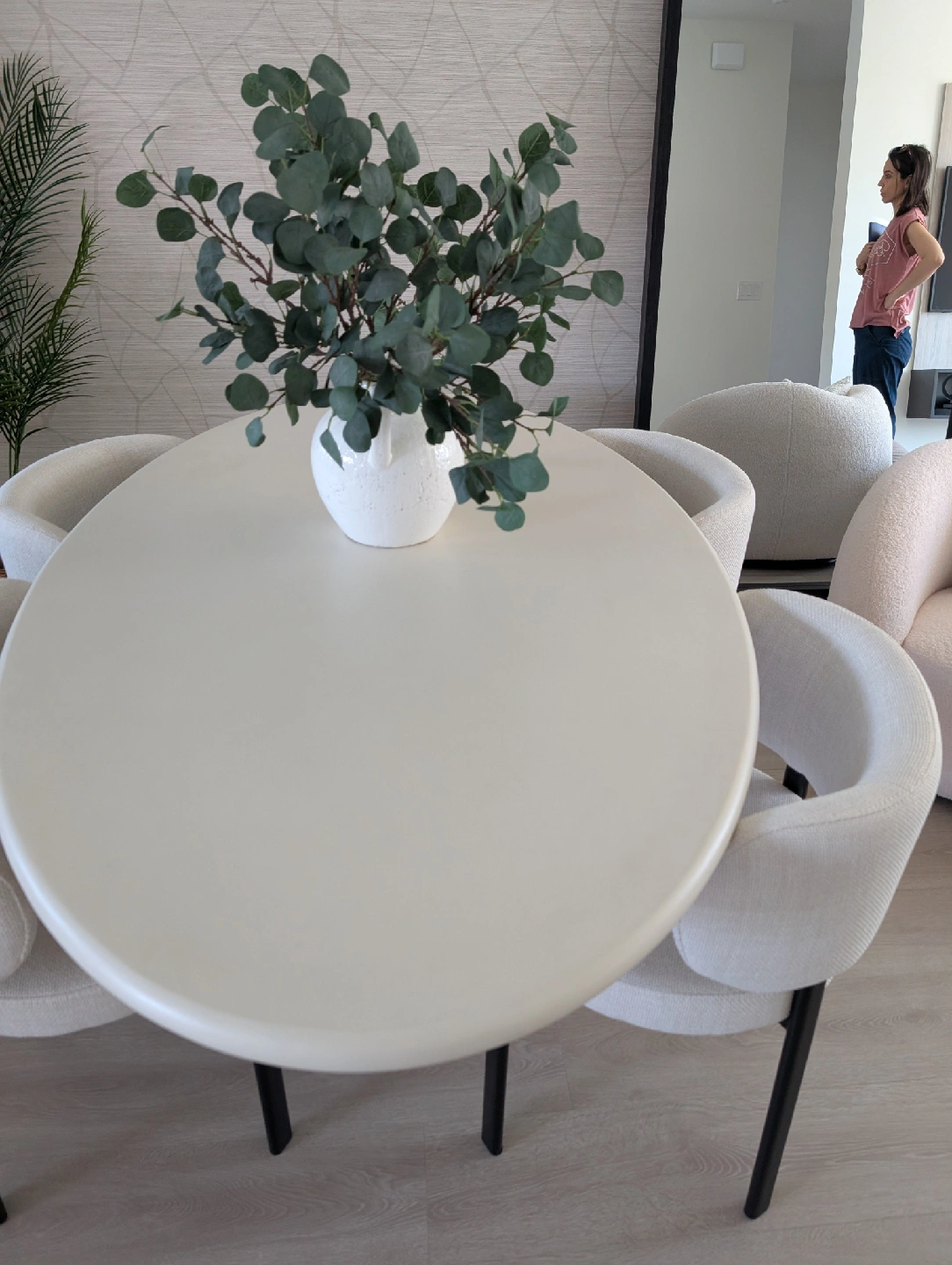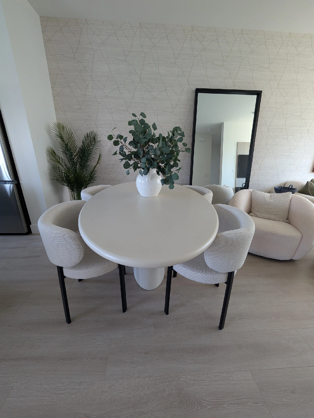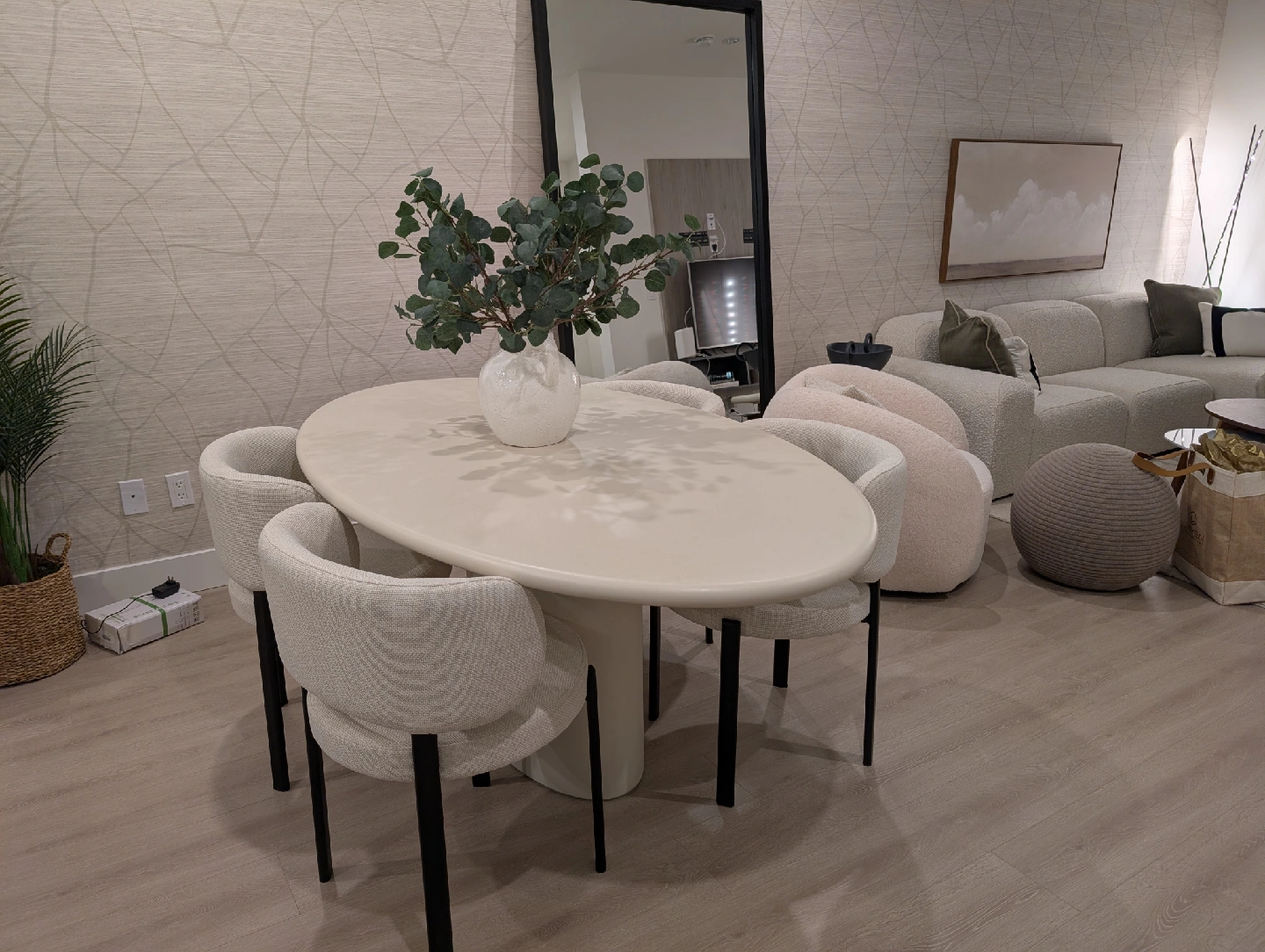 Selling a luxury dining set from our brand new display townhouse in Vancouver. This was used for staging only — never dined on, showroom condition. Set includes: The Table: Mobital “Tugg” 71" Oval Dining Table Finish: Ivory Tusk Microskin with Microskin base Dimensions: 71"L x 43"W x 30"H Original retail: $4,800+ CAD Note: Minor defect on the edge of the tabletop (see last image posted). The Chairs: 4 x Mobital “Lily” Upholstered Dining Chairs Color: Soft grey velvet / brushed metal legs Modern, comfortable and elegant Original retail: $1,060 CAD per pair / ~$2,100 total for 4 chairs (Retail value of the set plus taxes would be close $8,000 )