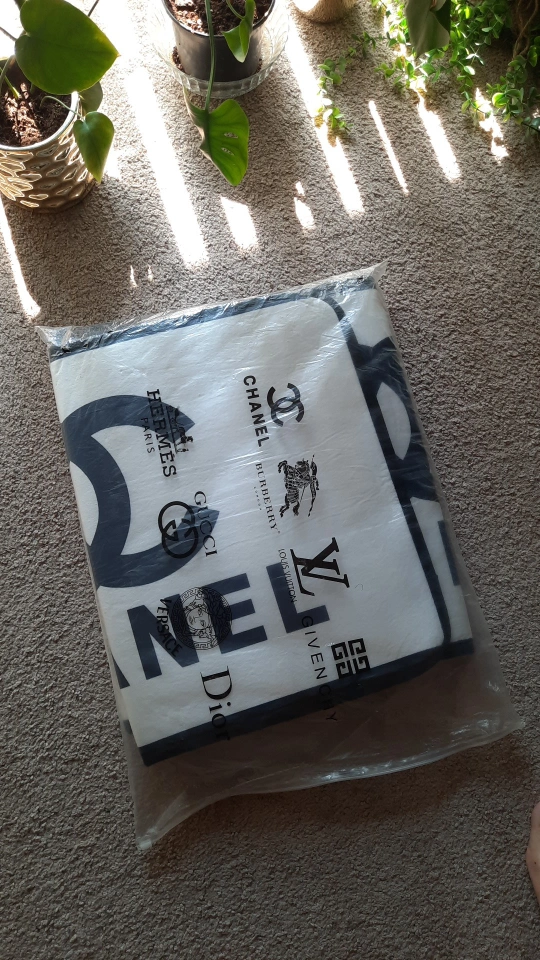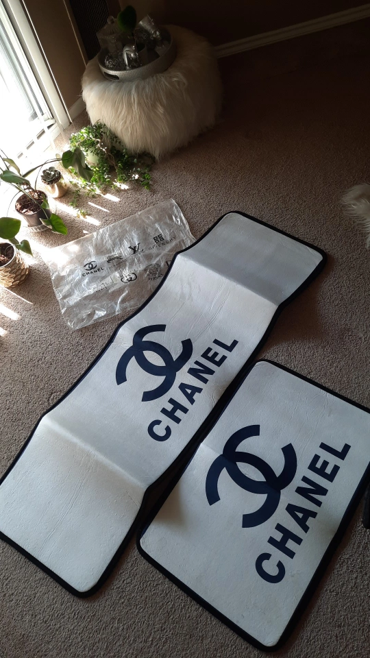 Two designer logo room mats. One is longer than the other. The longer and shorter mat both have logo. White and Black, Comfy, Thin cushion material. Stylish, classy, fashion. Great gift.